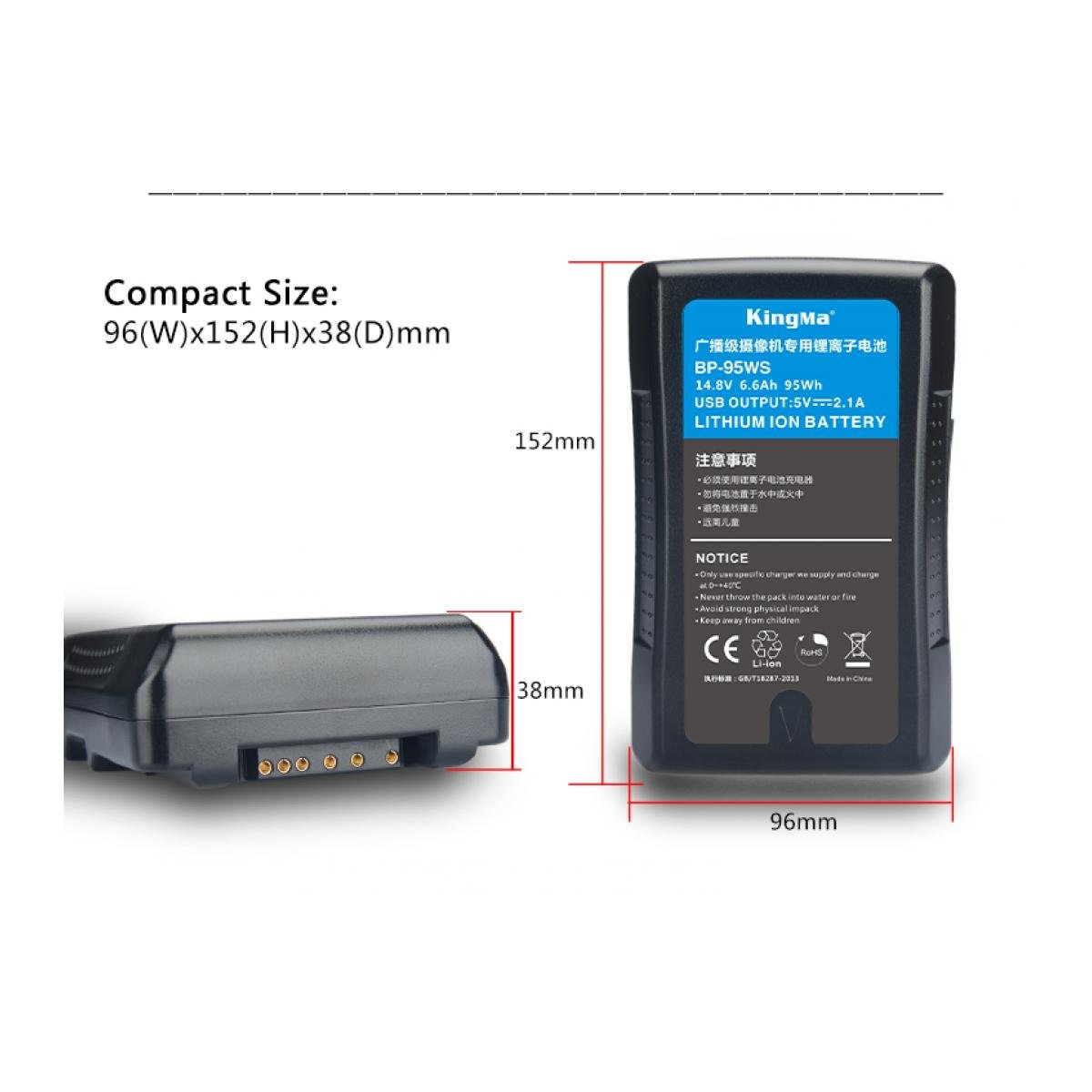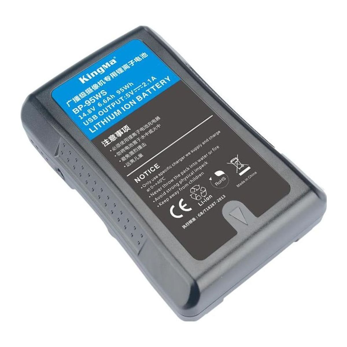 Акумуляторна батарея KingMa V Mount / V-Lock - 95 Wh 14.8V 6600 mAh - призначена для професійних камер та обладнання, що використовують IDX V-Mount (V-Lock) систему: Sony, Red, Canon, Arri, Blackmagic, Panasonic, JVC та інші. Акумулятор обладнаний USB та D-Tap портами, що дозволяє використовувати батарею як зовнішнє джерело живлення для пристроїв різного типу.
