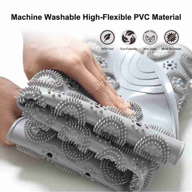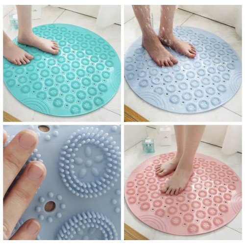 Антиковзний масажний килимок для ванної на присосках — практичний аксесуар для ванної кімнати, який допомагає зменшити ковзання на мокрій поверхні та забезпечує приємний масажний ефект для стоп під час щоденних водних процедур. Виготовлений із ПВХ, килимок розрахований на регулярне використання та надійно фіксується на дні ванни завдяки присоскам.