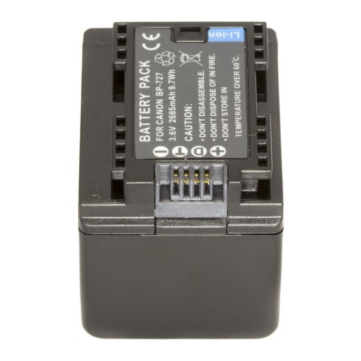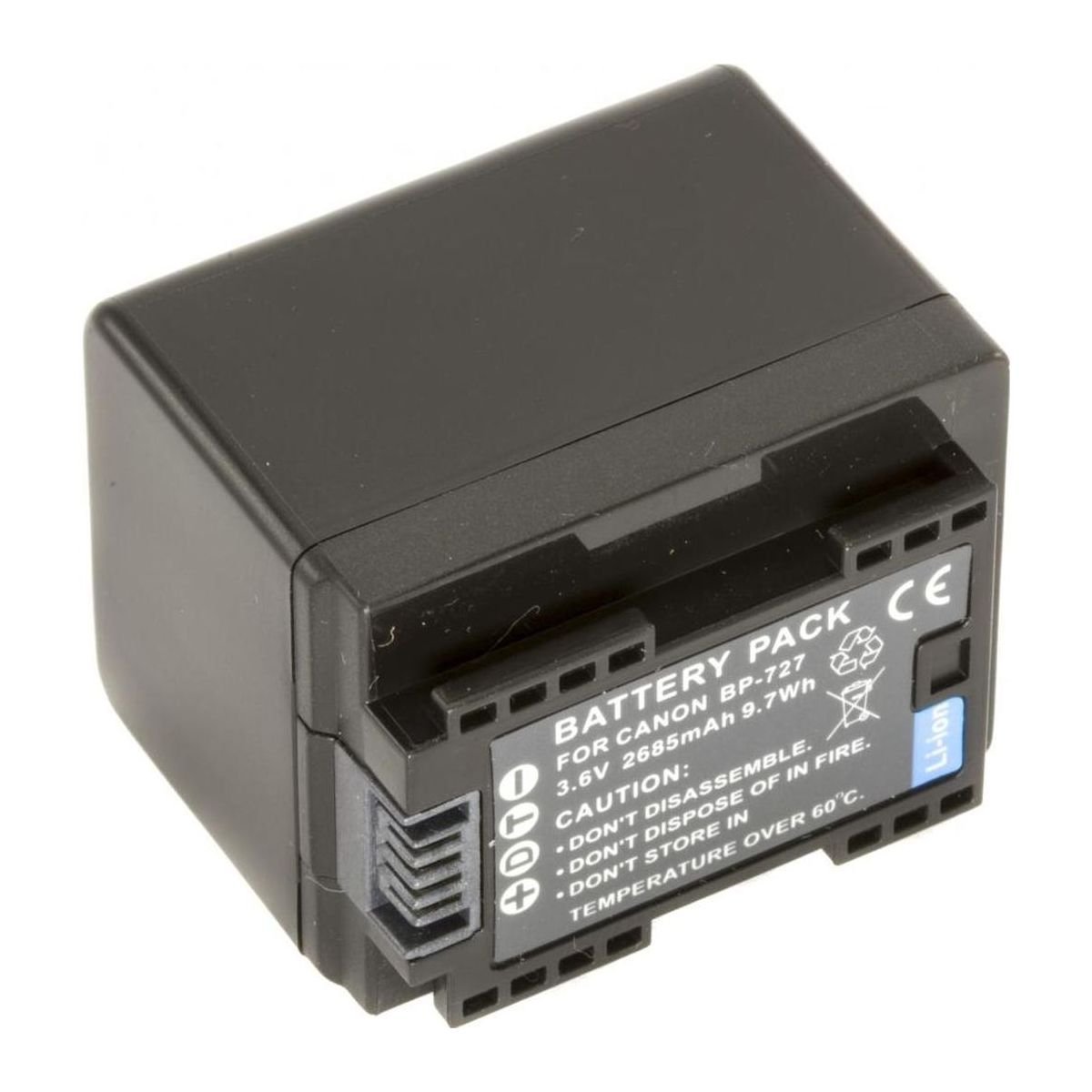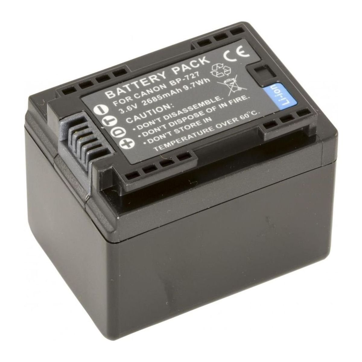 Батарея BP-727, ємністю 2685 mAh, 100% сумісна з оригінальним акумулятором CANON BP-727. Батарея містить «інфо-чіп», який дозволяє відображати залишок часу заряду або кількість кадрів на дисплеї камери, і заряджати акумулятор як від оригінального зарядного пристрою CANON CG-700.