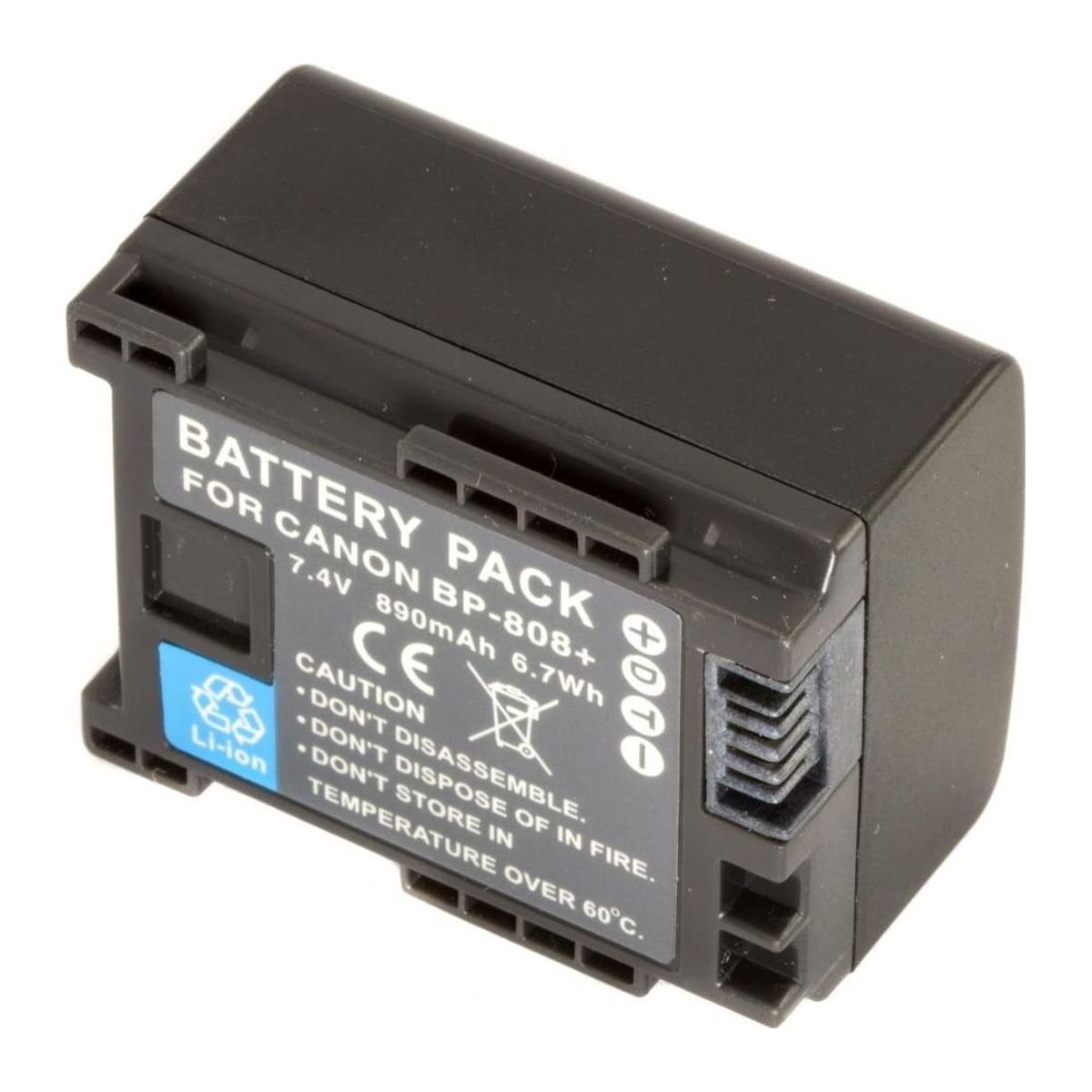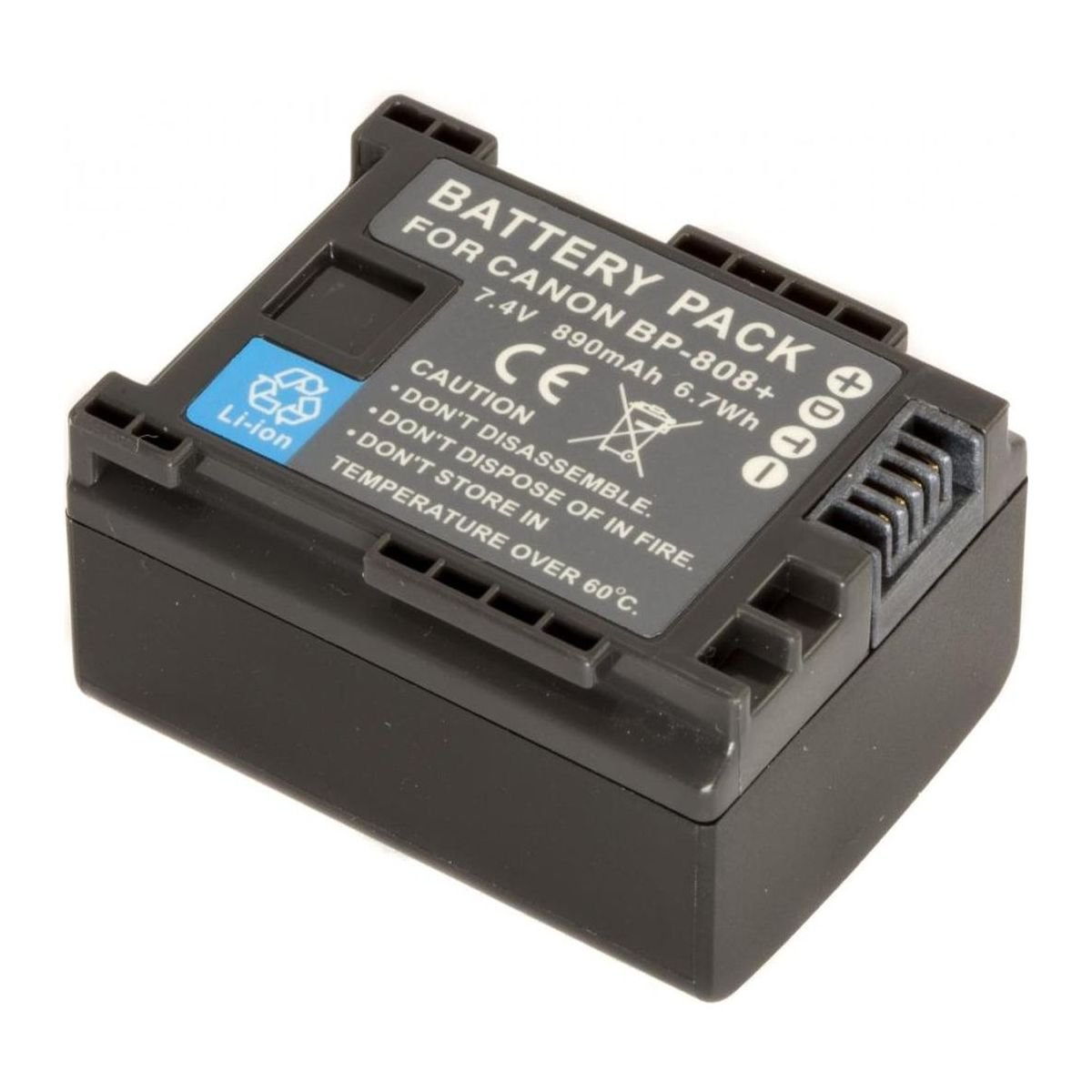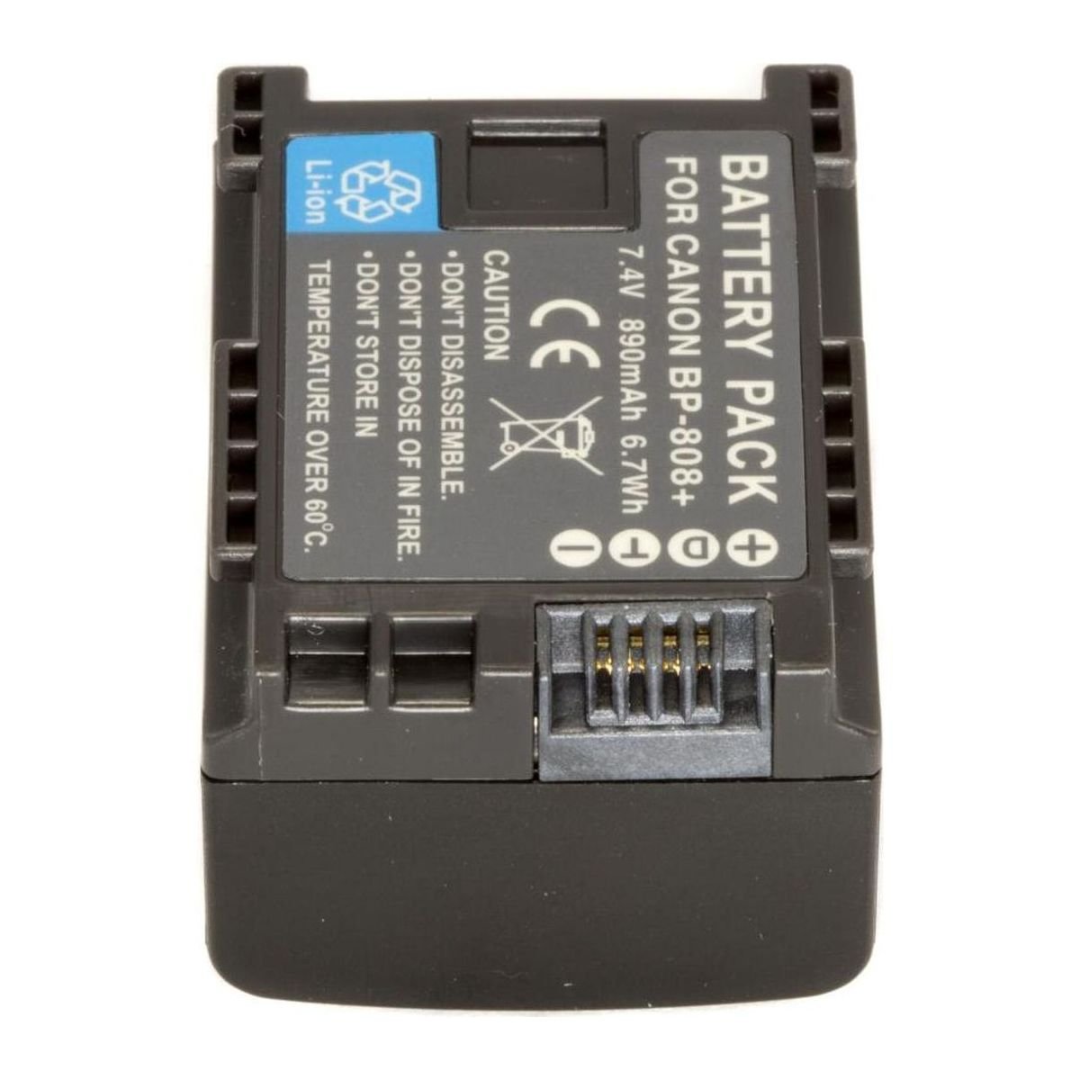 Батарея BP-808, ємністю 890 mAh, 100% сумісна з оригінальним акумулятором CANON BP-808. Батарея містить «інфо-чіп», який дозволяє відображати час заряду, що залишився, або кількість кадрів на дисплеї камери, і заряджати акумулятор як від оригінального зарядного пристрою CANON CG-800.