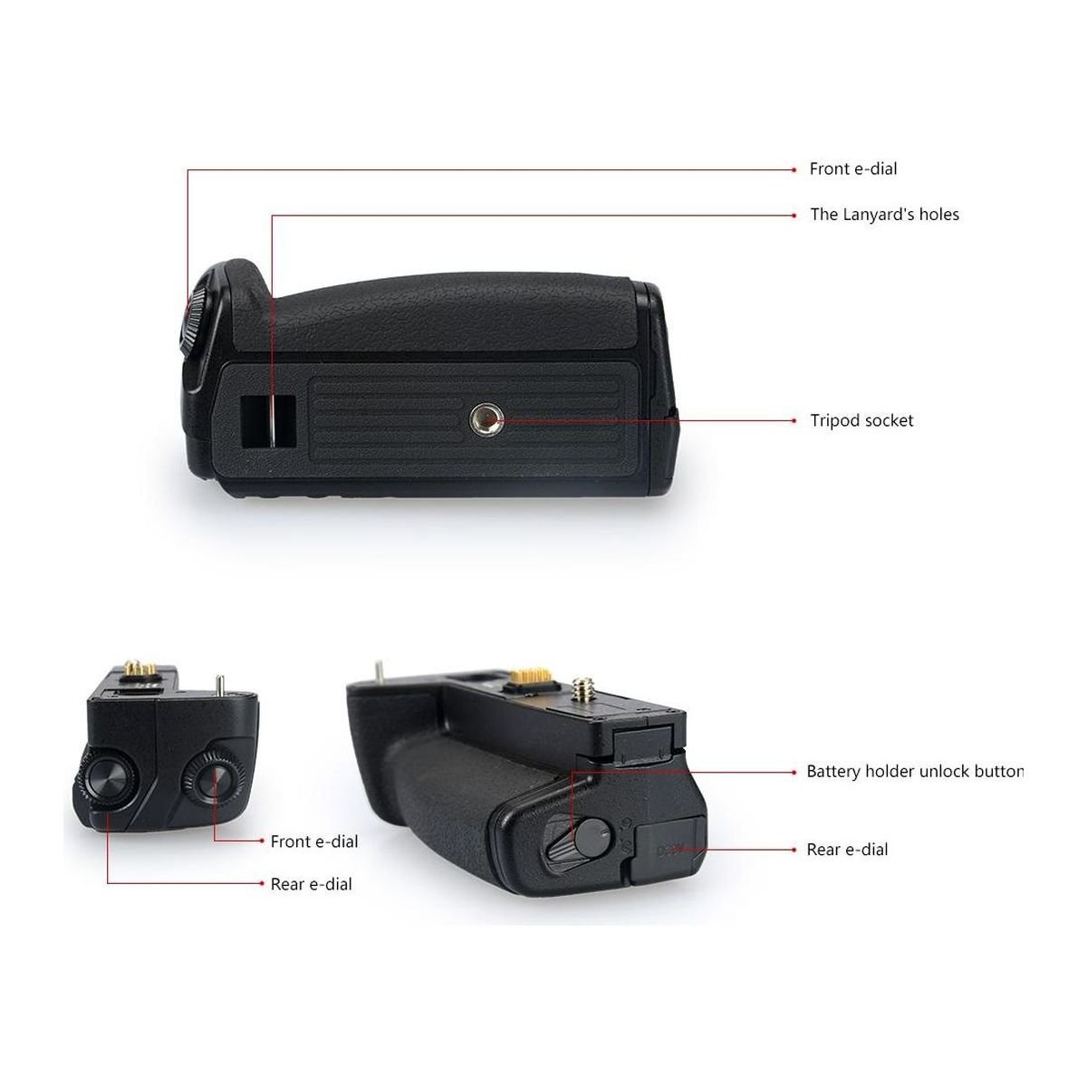 - Батарейна ручка оснащена кнопкою спуску затвора, автофокусування, корекції експозиції, основним диском та іншими елементами керування, що дозволяють робити вертикальні знімки так само легко, як і горизонтальні.
