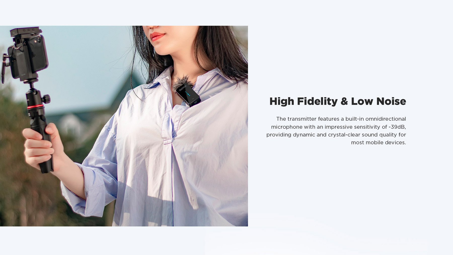 Технологія 2,4 ГГц забезпечує високоякісний звук BY-XM6-K4 відтворює професійний звук високої чіткості завдяки точному відтворенню тону на цифровій частоті 2,4 ГГц. Система уникає перешкод від телевізійних та радіохвиль, працюючи в частотному діапазоні 2,4 ГГц, який передає стабільні та вільні від перешкод сигнали на відстань до 100 м. Завдяки більшій дальності дії та часу автономної роботи до 7 годин користувачі можуть робити ширші та об'ємніші знімки , не побоюючись випадання кадрів та маючи можливість знімати протягом цілого дня на одному заряді.