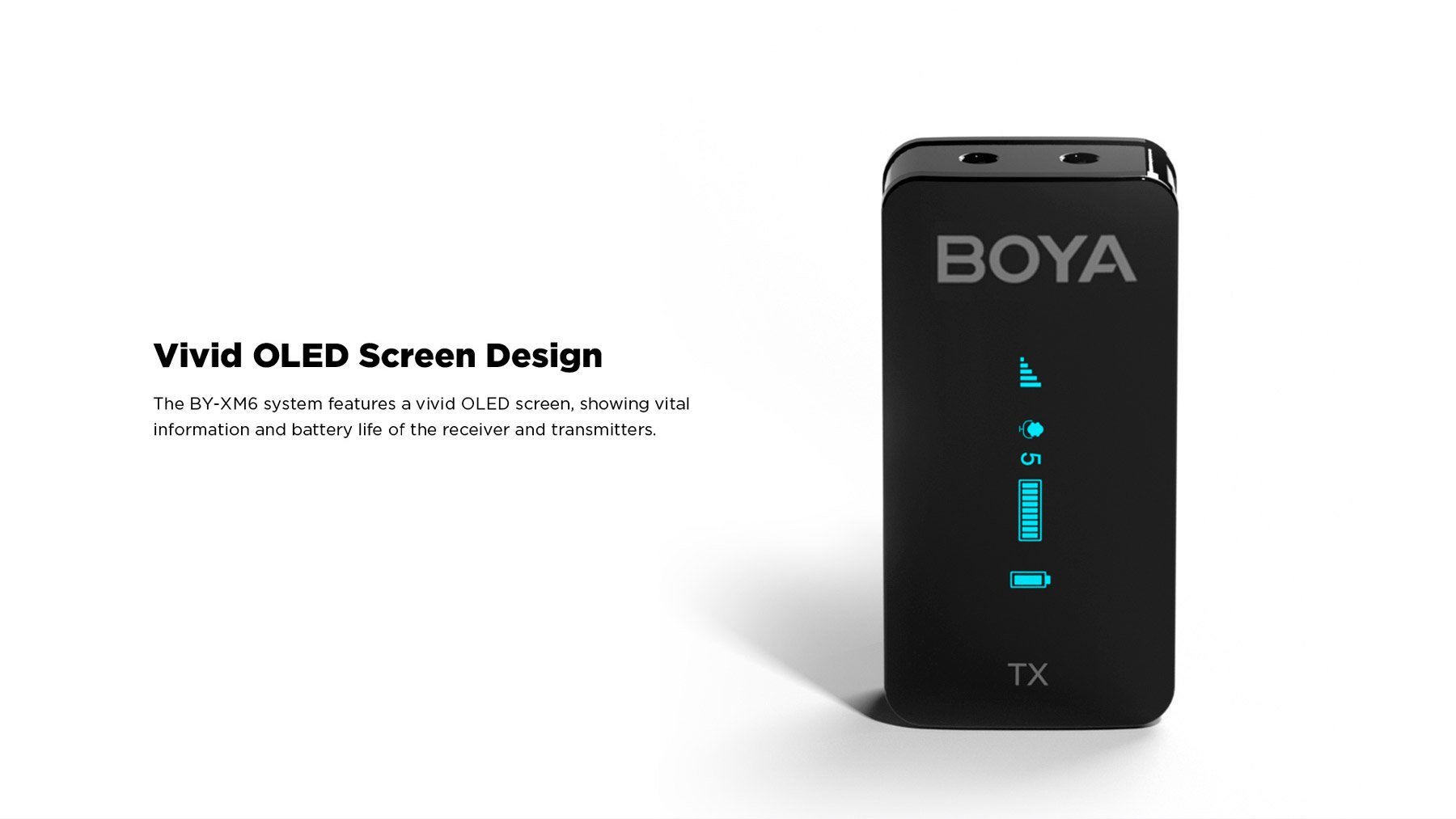Неймовірний бездротовий мікрофон Завдяки яскравому та легко читаному OLED-дисплею на передавачі та приймачі користувачі можуть точно налаштувати передачу сигналу. Передавач оснащений вбудованим всеспрямованим мікрофоном, тому користувачі можуть прикріпити передавач до нашийника, щоб уловлювати звуки, а також підключити до вхідного роз'єму MIC IN передавач мікрофон для захоплення звуку. Серія BY-XM6 поставляється з повним набором аксесуарів у кожній упаковці, таких як мікрофони та зарядні кабелі, що є економічно вигідним вибором. BY-XM6 K4 оснащений портативним, але потужним зарядним кейсом, що дозволяє легко переносити його поза домом. Завдяки вбудованому потужному акумулятору, зарядний кейс дозволяє повністю заряджати обидва передавачі одночасно, без необхідності використання кабелю. Крім того, індикатор живлення на зарядному кейсі дозволяє легко перевірити ємність батареї та стан зарядки.
