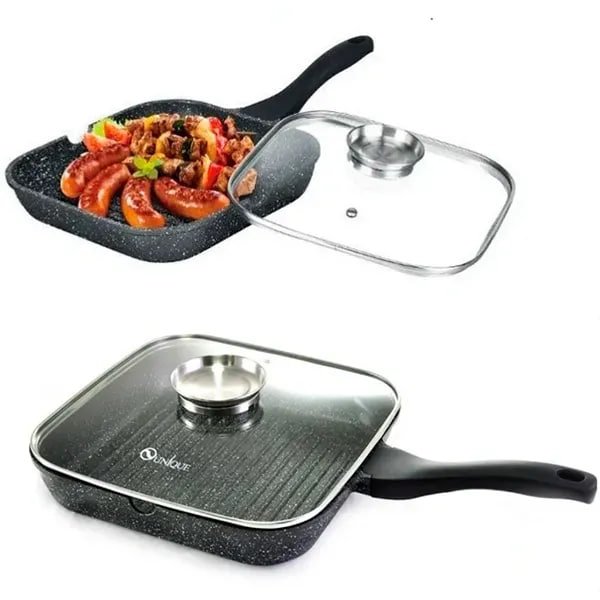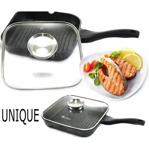 Гранітна сковорода UNIQUE UN-4011 24 см для гриля — прямокутна гриль-сковорода для здорового приготування страв щодня. Завдяки рифленій поверхні допомагає отримати апетитні смужки гриля та зменшити кількість зайвого жиру під час смаження. Якісне виконання робить цю модель надійним вибором для регулярного використання на кухні.