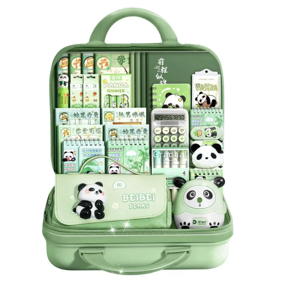 Канцелярський набір “Панда” 55 в 1 — великий набір канцелярії у зручному кейсі-валізці з кодовим замком. Практичне рішення для школи, дому або поїздок: усе необхідне зібрано в одному місці та акуратно впорядковано. Набір якісний і надійний, підходить для щоденного використання.