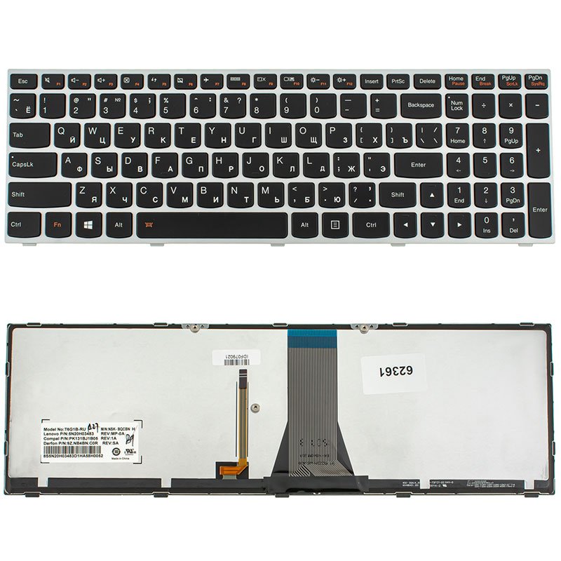 Клавіатура для ноутбука Lenovo G50-30, G50-45, G50-70, Z50-70, Z50-75, Flex 2-15 — чорна, срібляста рамка, підсвітка клавіш, розкладка RU
