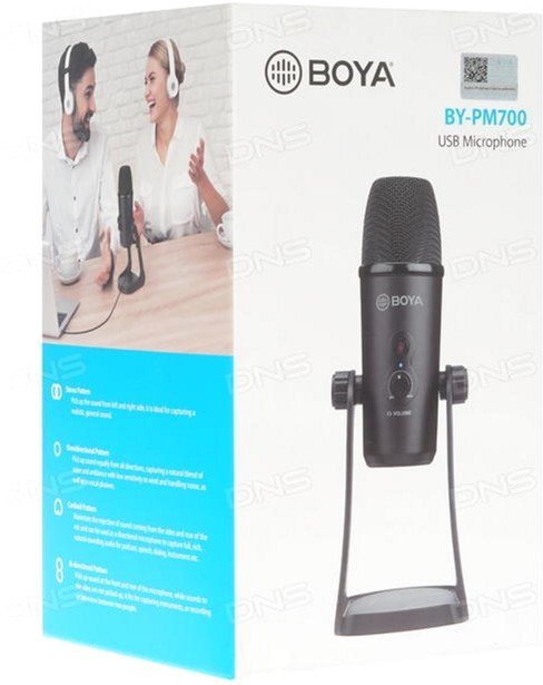 Мікрофон студійний Boya BY-PM700 — Просунутий USB-мікрофон, що підключається безпосередньо до комп'ютерів на базі Windows або Mac OS. Вбудований аналого-цифровий перетворювач з високою якістю дискретизації (16 біт, 48 кГц) забезпечує стабільно хороший звук, який не залежить від якості звукової картки вашого ПК або ноутбука. Відсутнє відставання звуку від відео. При підключенні мікрофон швидко і коректно визначається операційною системою і може використовуватися у всіх програмах для аудіо/відео.