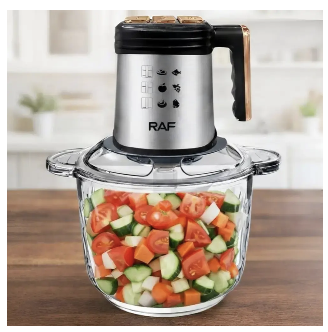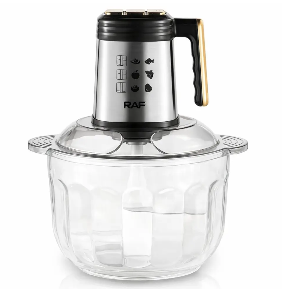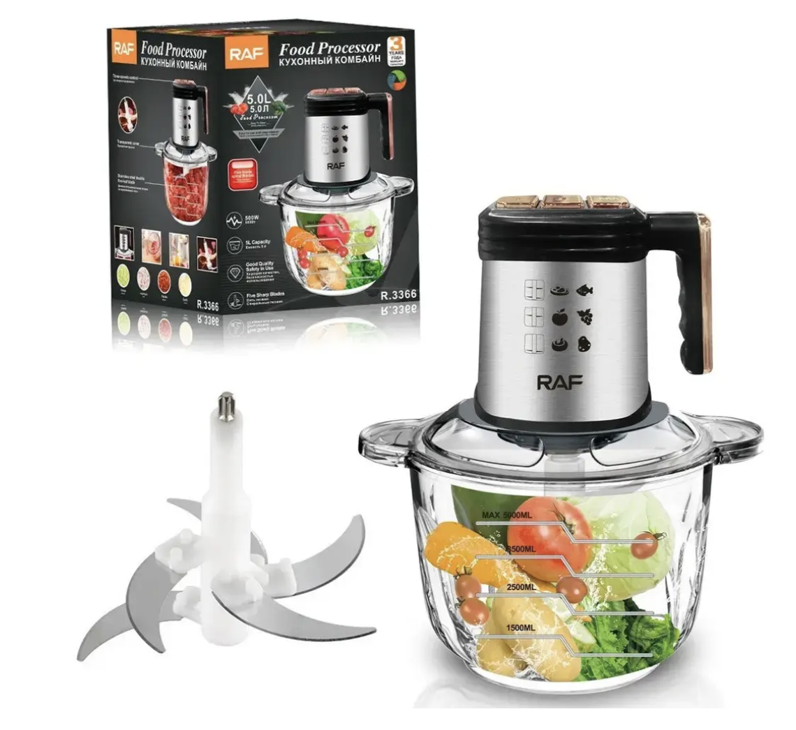 ```Кухонний комбайн-подрібнювач RAF R.3366 — практичний помічник для щоденного приготування страв. Завдяки місткій чаші з нержавіючої сталі та потужності 500 Вт він підходить для швидкого подрібнення інгредієнтів у домашніх умовах. Модель виконана з якісних матеріалів, розрахована на регулярне використання та проста в догляді.