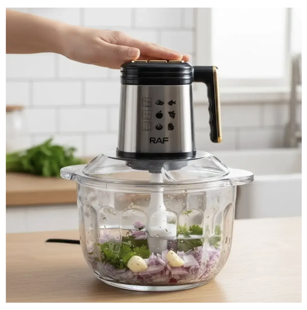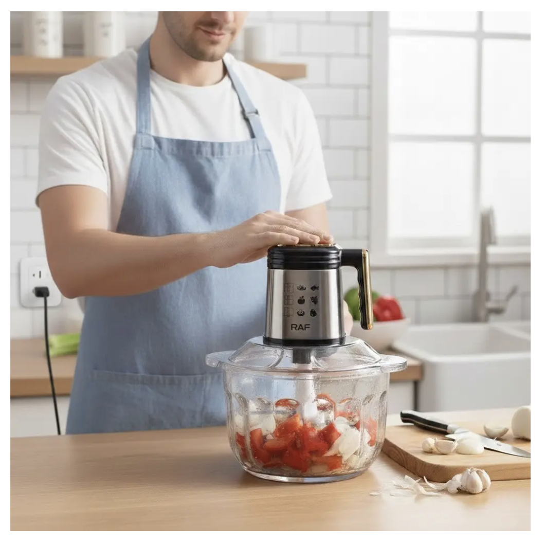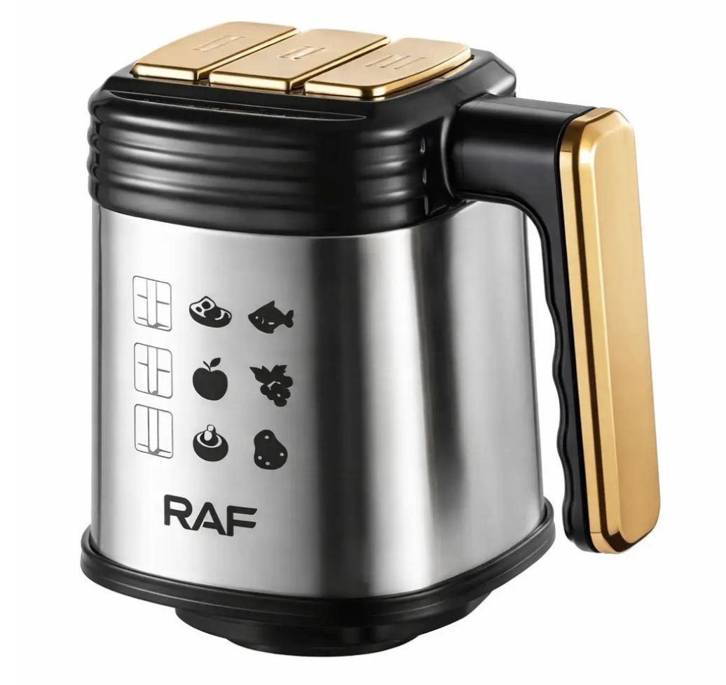 ```Кухонний комбайн-подрібнювач RAF R.3366 — практичний помічник для щоденного приготування страв. Завдяки місткій чаші з нержавіючої сталі та потужності 500 Вт він підходить для швидкого подрібнення інгредієнтів у домашніх умовах. Модель виконана з якісних матеріалів, розрахована на регулярне використання та проста в догляді.
