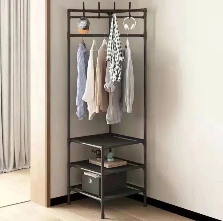 Кутова підлогова вішалка-стелаж Corner rack — практичне рішення для передпокою, яке допомагає раціонально використати кут і підтримувати порядок. Стійка має поперечину для розміщення вішалок та відкритий стелаж для зберігання повсякденних речей. Підходить для щоденного використання, зручна у побуті та розрахована на тривалу експлуатацію.