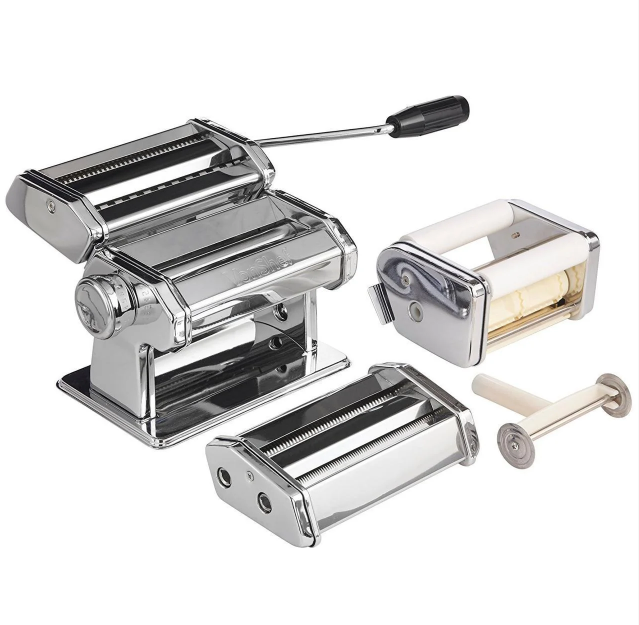 Pasta Set — лапшерізка та тестораскаточна машина (паста-машина) для домашнього приготування пасти й локшини. Пристрій поєднує тестораскатку та лапшерізку, допомагаючи швидко розкачати тісто й нарізати його на локшину/пасту. Це якісний і надійний товар, зручний для щоденного використання на кухні.