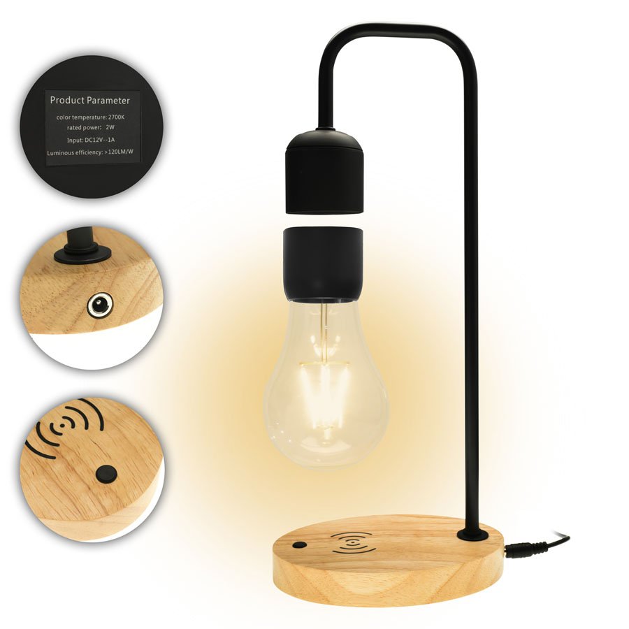 Левітуюча лампа-нічник “Лампочка” на квадратній підставці — стильний та сучасний декоративний світильник, у якому “лампочка” візуально левітує над основою. Модель виконана у чорному кольорі з елементами з дерева, добре підходить для інтер’єру спальні, вітальні або робочого столу. Це якісний і надійний товар для щоденного використання.
