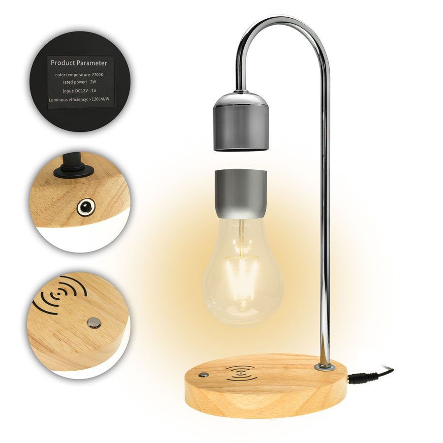 Левітуюча лампа-нічник «Лампочка» на напівкруглій стійці, silver, дерево