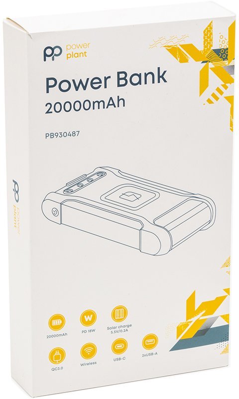 Мобільна батарея PowerPlant 20000mAh, PD 18W, USB-C, 2xUSB-A, QC3.0, Wireless, Solar panel 5.5V-0,2A