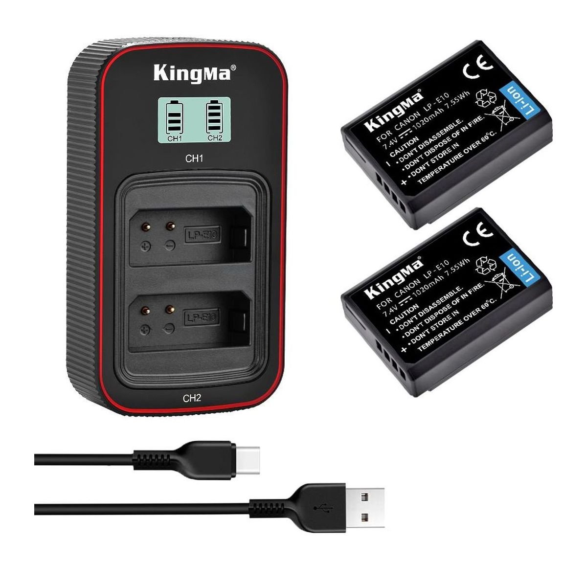 BestBatt 3-Pack KingMa Canon LP-E10 — практичний набір для власників камер Canon: 2 акумулятори KingMa LP-E10 та 1 подвійний зарядний пристрій для одночасного заряджання двох батарей. Підійде як основне рішення або як надійний запас у поїздках і для щоденної зйомки.