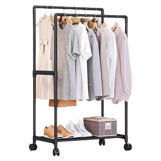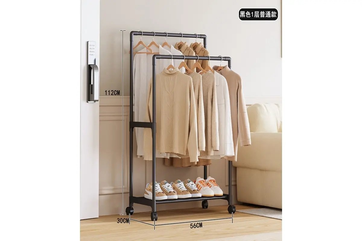 ```Стійка-вішалка на коліщатках для речей та взуття (YH9918-1) — універсальна пересувна стійка для одягу з полицею, яка допомагає зручно організувати зберігання речей у кімнаті, гардеробній, офісі або шоурумі. Практичне рішення для щоденного використання: легко переміщується та забезпечує швидкий доступ до одягу й взуття.