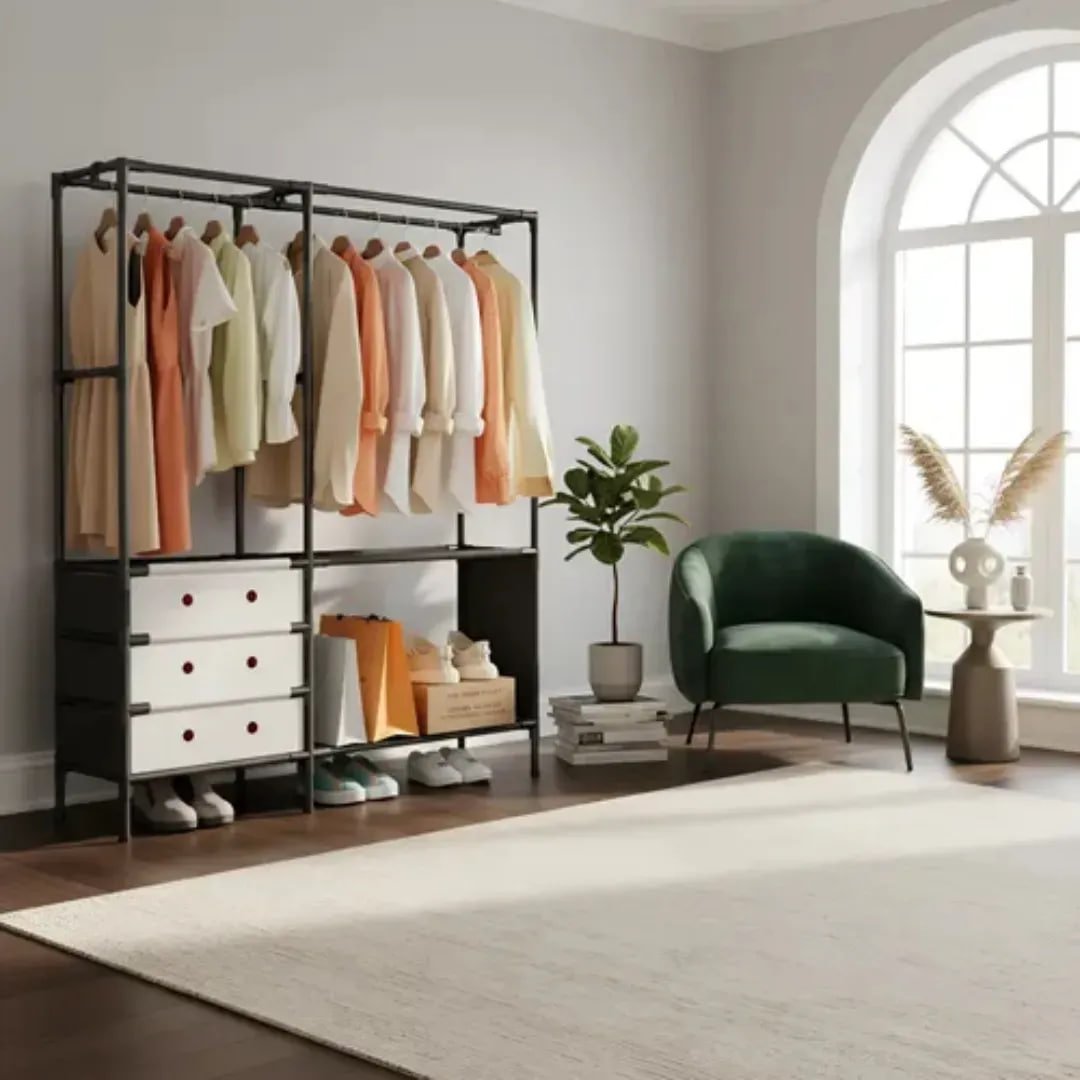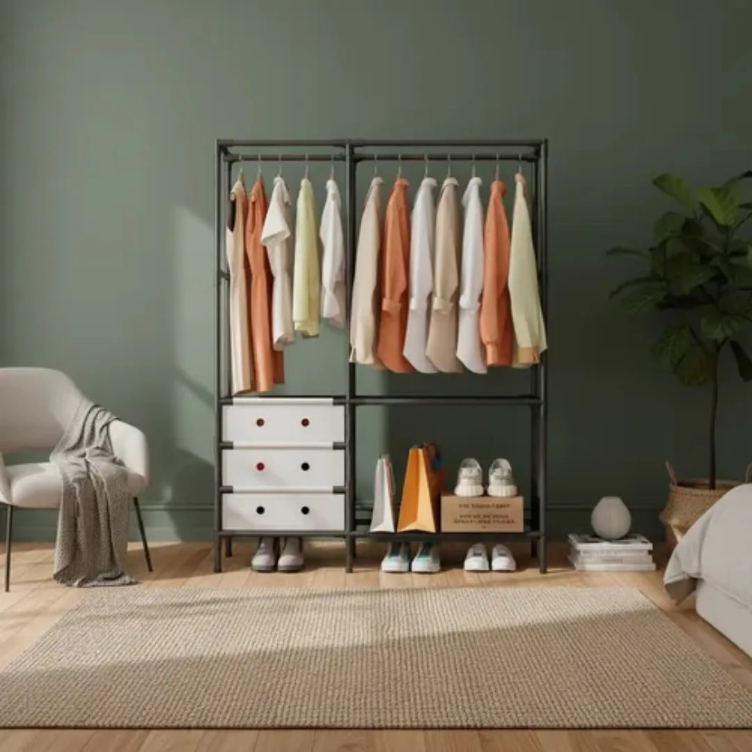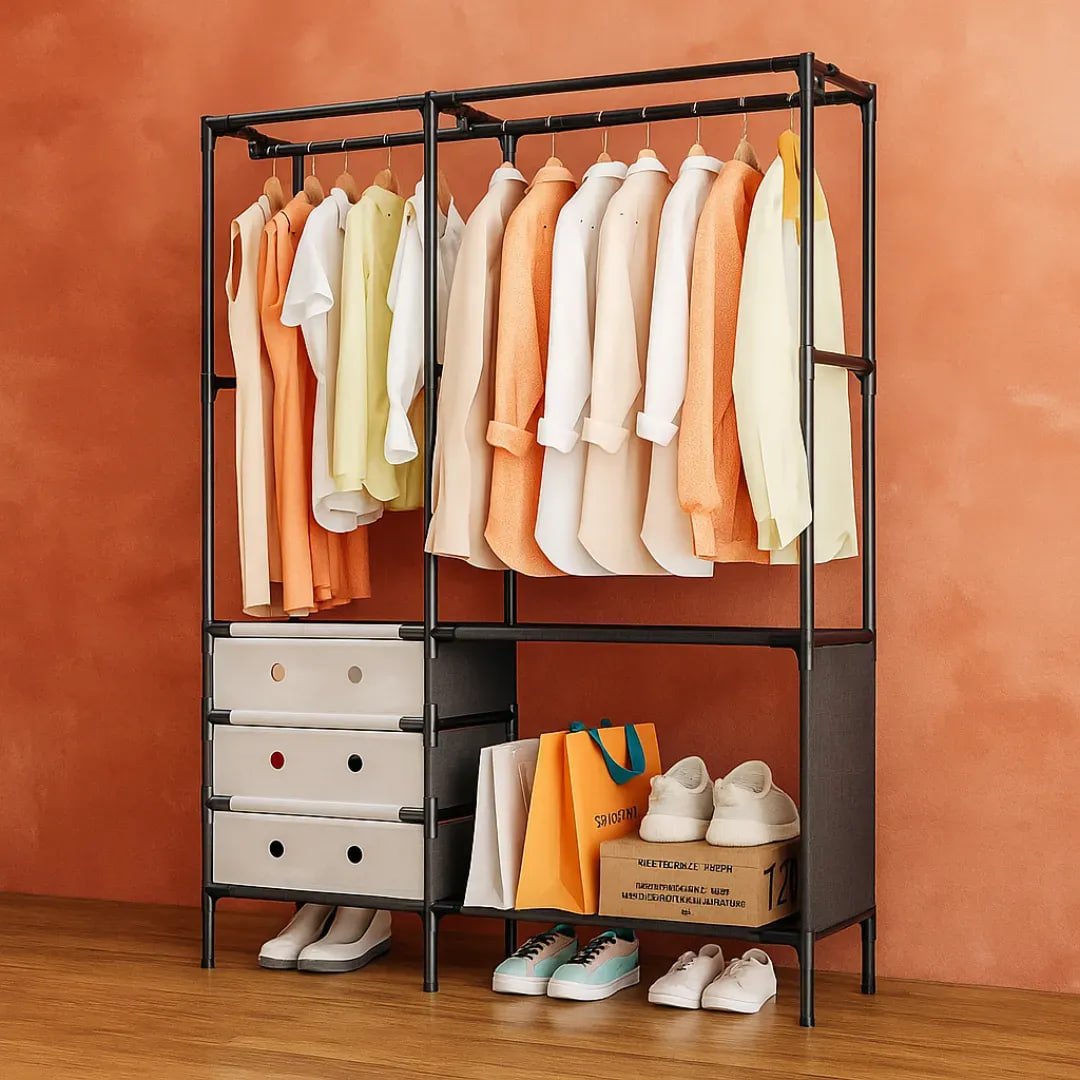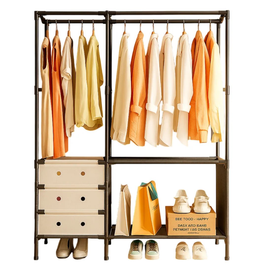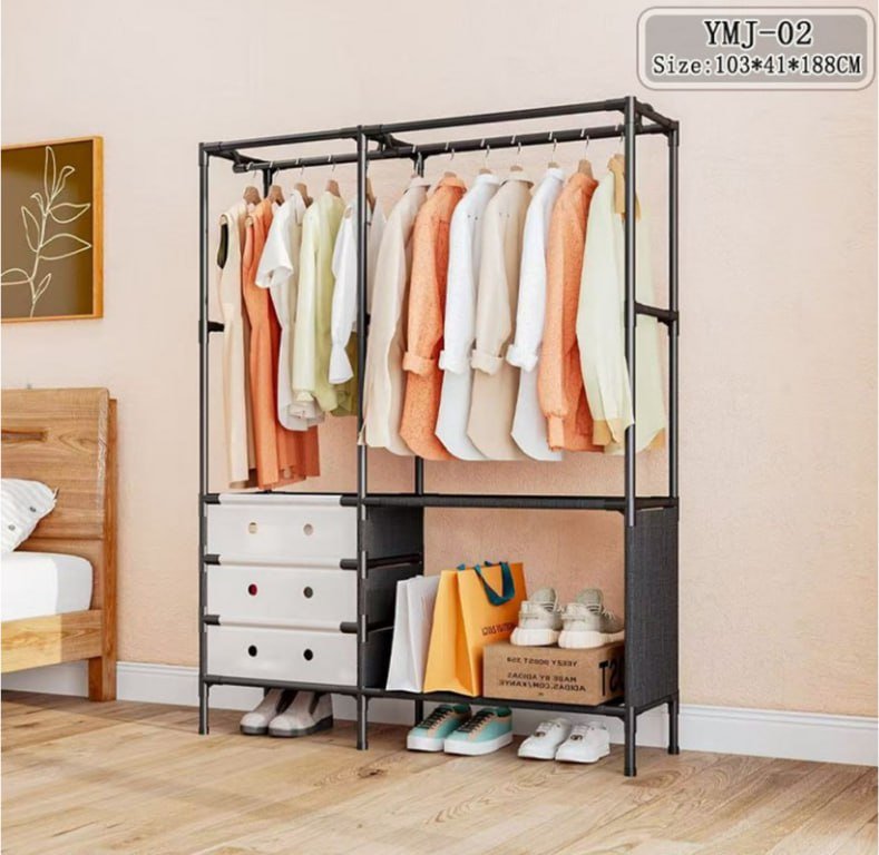 ```Підлогова вішалка-стійка для одягу YMJ-02 — практичне рішення для організації одягу вдома, в офісі або гардеробній. Модель поєднує вішалку для розміщення одягу та полиці для зберігання взуття або аксесуарів. Підходить для щоденного використання, забезпечує зручне та охайне зберігання речей.