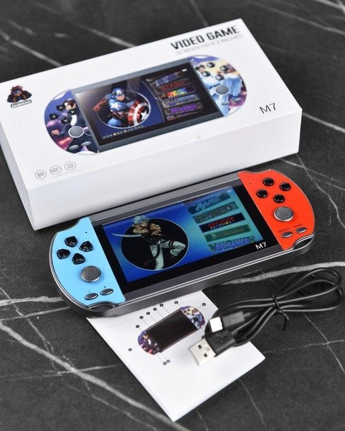 ```Ігрова портативна консоль M7 — компактна ретро-консоль для щоденного використання з якісним 4,3" IPS екраном та великою бібліотекою 10 000 ігор. Підійде для гри вдома, у дорозі або під час перерв — проста у використанні та надійна в повсякденній експлуатації.