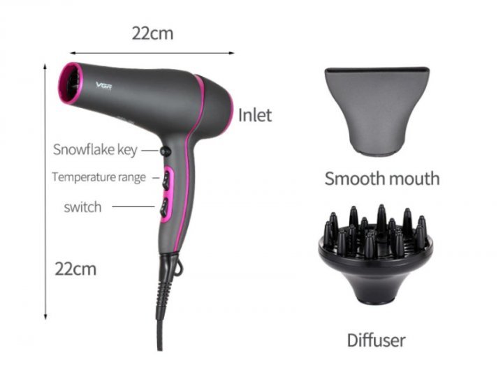Професійний потужний фен VGR V-402 — якісний та надійний фен для щоденного використання вдома або в салоні. Завдяки потужності 2200 Вт швидко висушує волосся та допомагає робити укладку. У комплекті є насадки для різних задач: концентратор для точного потоку повітря та дифузор для об’єму й роботи з хвилястим/кучерявим волоссям.