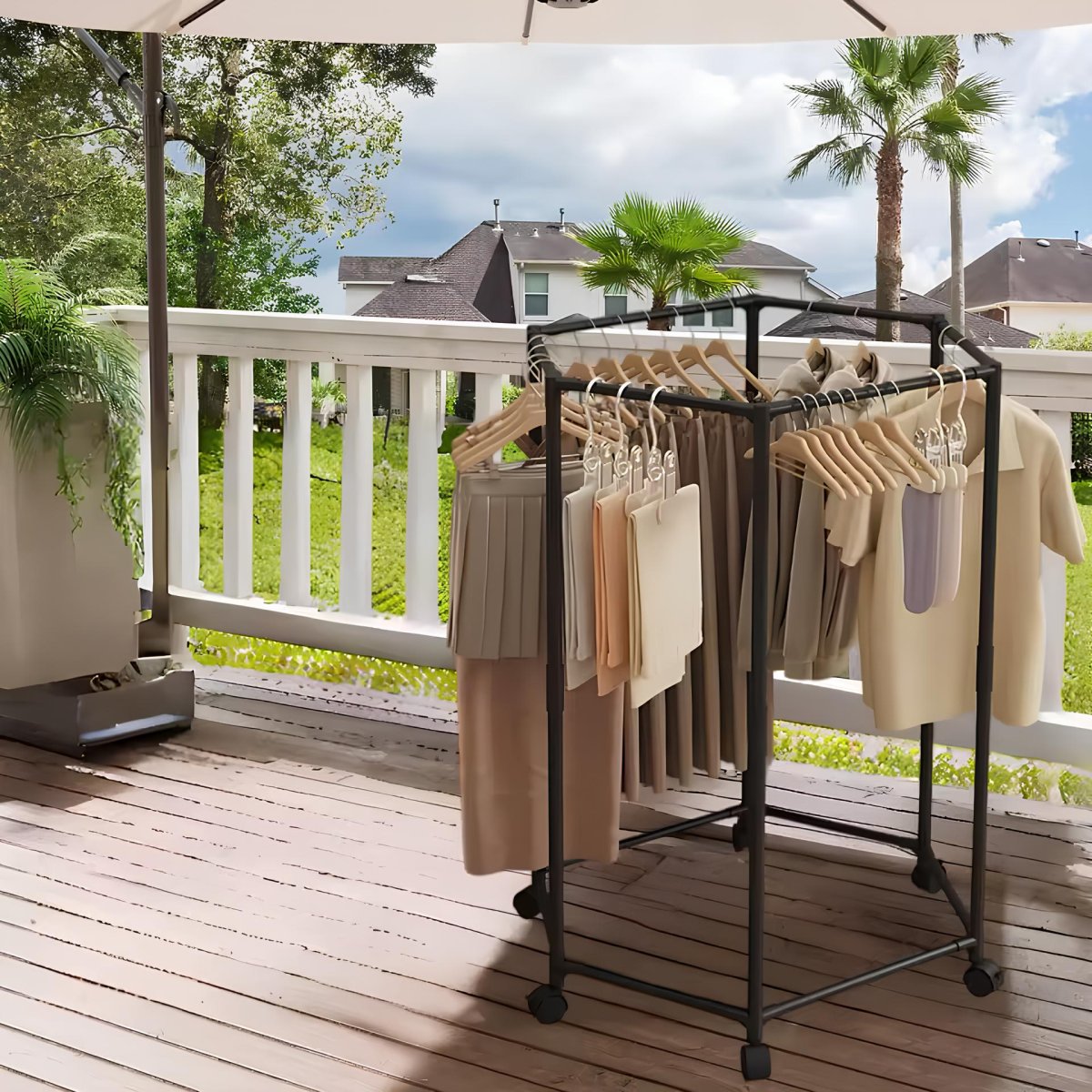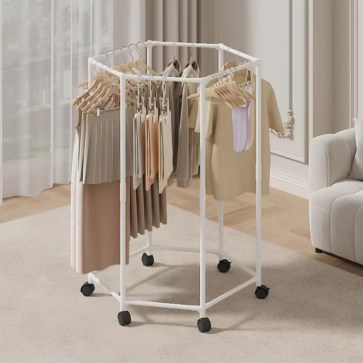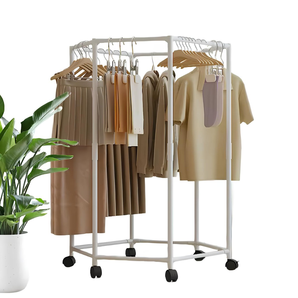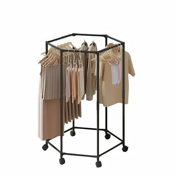 Вішалка для одягу з поворотом на 360° — практичне рішення для спальні та гардеробної. Шестикутна конструкція, що обертається, забезпечує зручний доступ до речей з будь-якого боку, а коліщатка дозволяють легко переміщувати вішалку по кімнаті. Підійде для щоденного використання як надійний і зручний органайзер для одягу.
