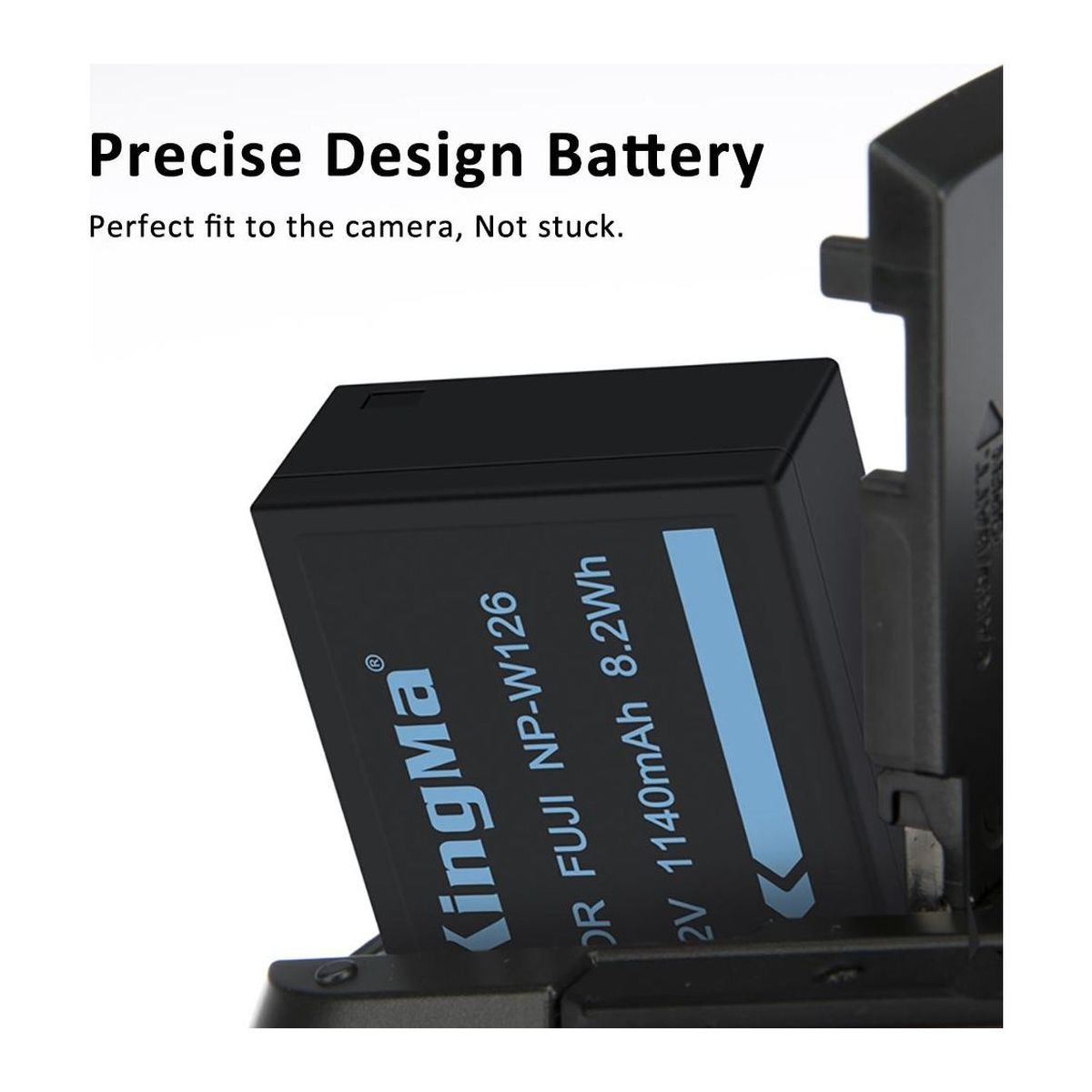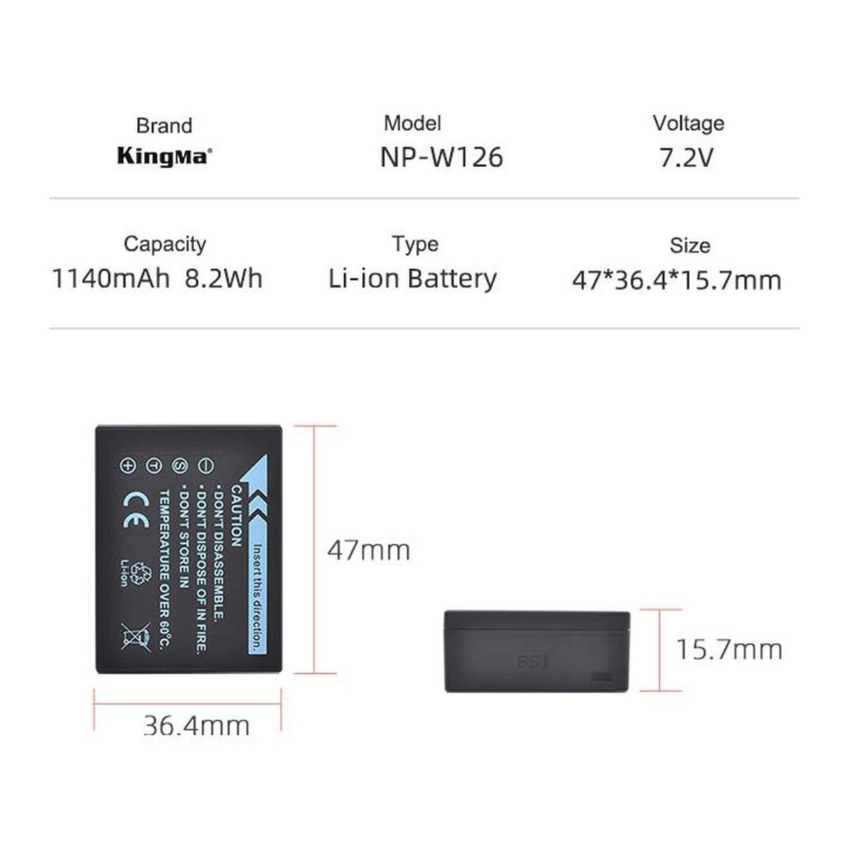 Акумуляторна батарея KingMa NP-W126 (заміна Fujifilm NP-W126) з технологією Smart IC Chip – це акумулятор нового покоління, що забезпечує безпомилкову комунікацію з камерою та на 100% відповідний оригінальному акумулятору по ємності, зносостійкості та функціональності. Підходить для камер Fujifilm.