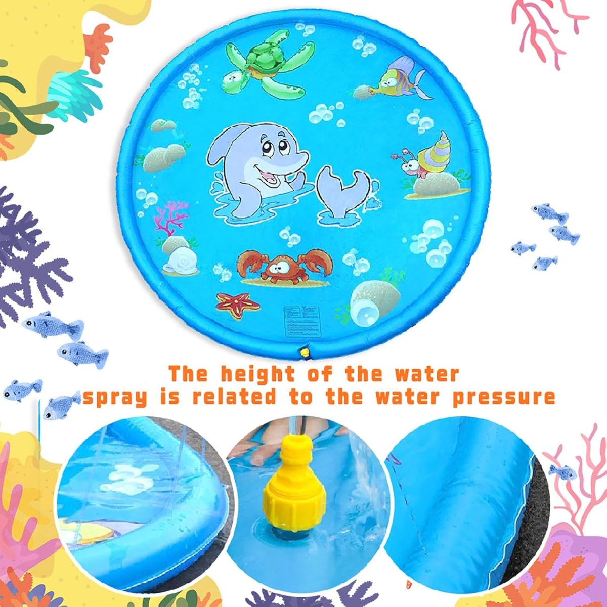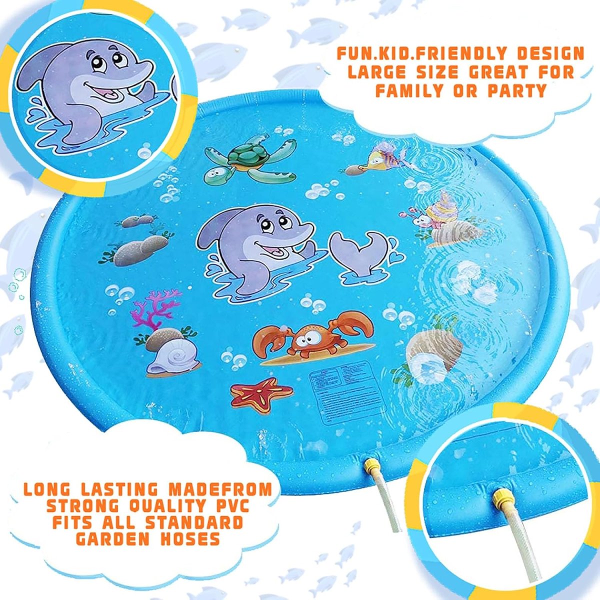 Ігровий водний килимок “Блакитний дельфін” 100 см — надувний басейн‑фонтан з розбризкувачем для активних літніх ігор на дачі та присадибній ділянці. Під’єднується до води та створює приємні водяні бризки, допомагаючи освіжитися в спеку. Виріб якісний і надійний, підходить для щоденного використання в сезон.