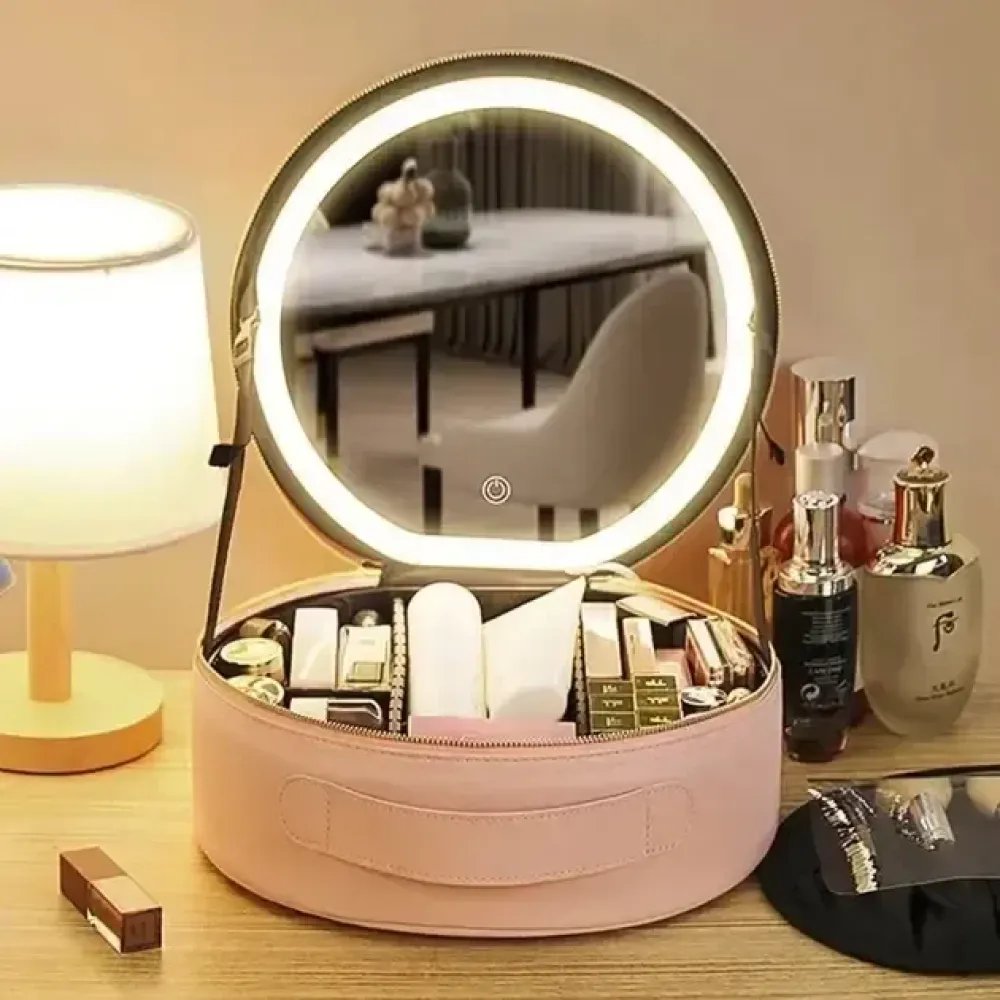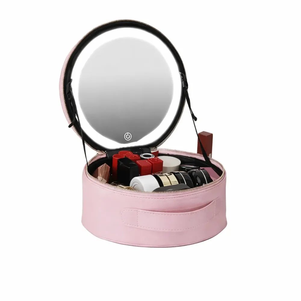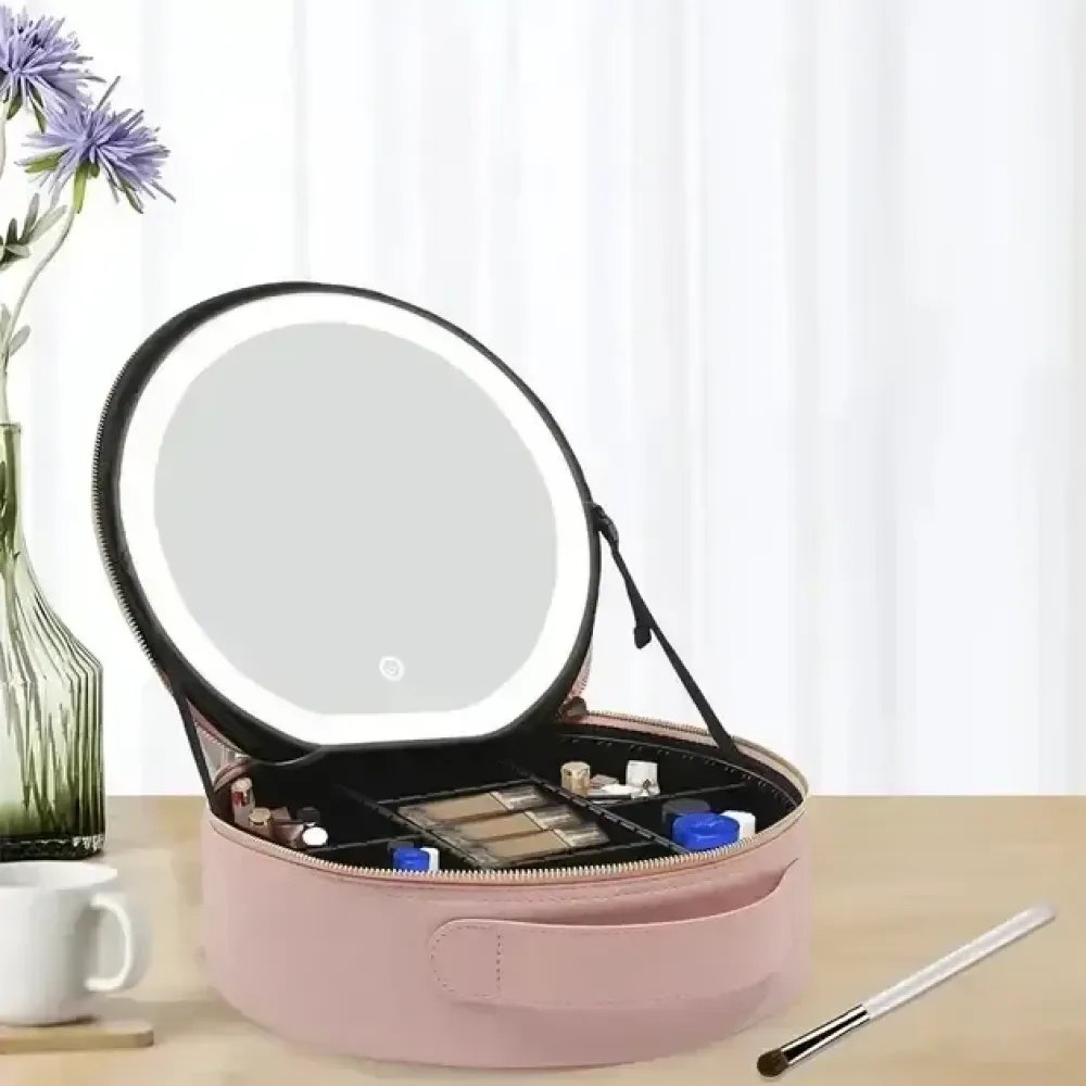 Дорожній органайзер-косметичка NiceLand з екошкіри з LED-дзеркалом і підсвіткою, рожева