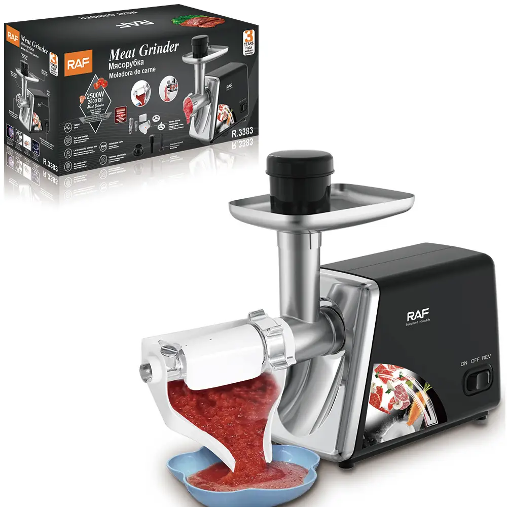 Електрична м'ясорубка RAF R.3383 — практичний і надійний прилад для щоденного використання на кухні. Модель оснащена захистом від перегріву та має потужність 2500 Вт, що забезпечує стабільну роботу під час приготування домашнього фаршу та інших страв. У комплекті передбачені насадки, які розширюють можливості використання м’ясорубки.