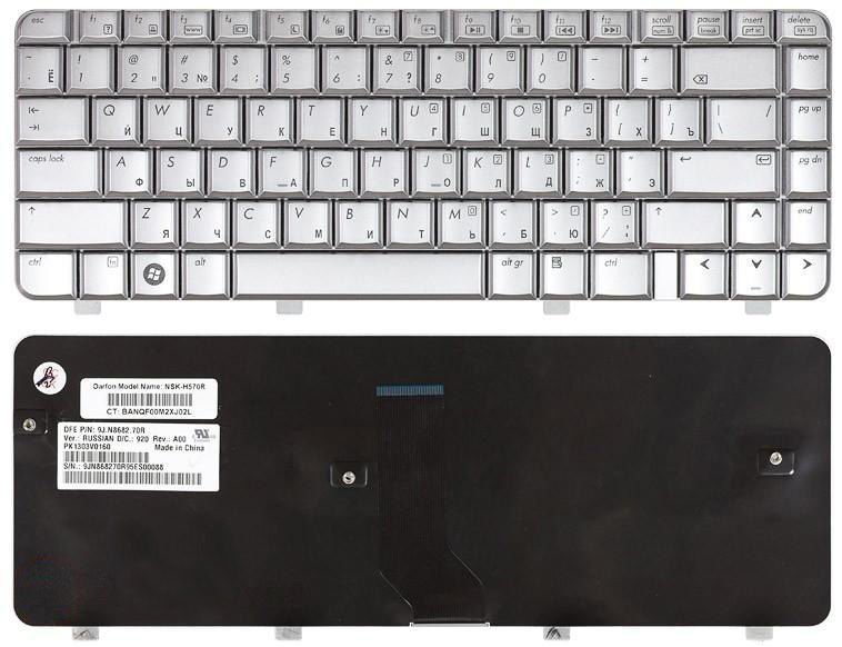 Срібляста клавіатура-аналог для HP Pavilion dv4‑1000 / dv4‑1100 / dv4‑1200 серій. Підтримує двомовну російсько‑англійську QWERTY‑розкладку. Часто продається як версія RU layout з кодом **NSK‑H570R** / **9J.N8682.70R** або під OEM‑кодом **PK1303V0160**. Також доступні generic silver RU-layout модулі без зазначеного номеру. Ідеально для заміни штатної клавіатури у вказаних моделях.