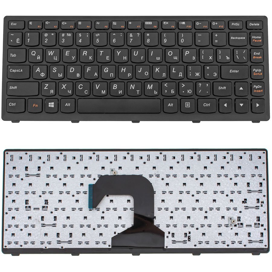 Чорна клавіатура з російською розкладкою для ноутбуків Lenovo S300, S400 та S405. Має компактний дизайн без цифрового блоку, зручний хід клавіш та надійне підключення через шлейф. Підходить для швидкої заміни та забезпечує комфортну роботу.