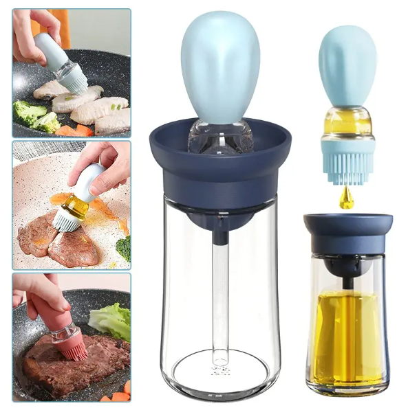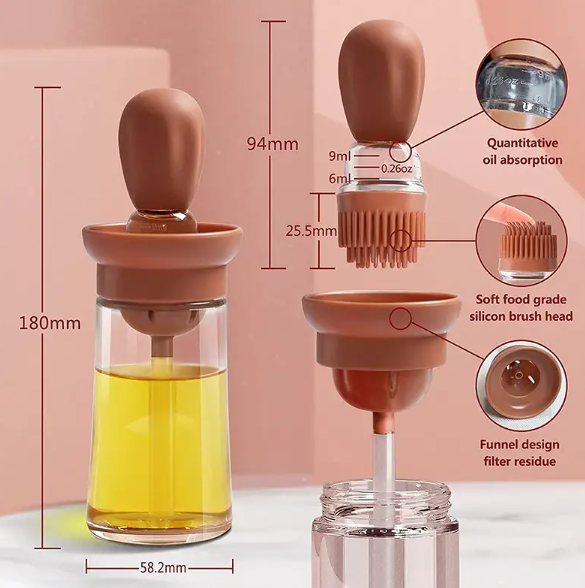 Кухонний диспенсер–дозатор олії з пензликом — зручний аксесуар для щоденного використання на кухні. Скляна пляшка підходить для олії, оцту та соусів, а пензлик допомагає акуратно наносити рідину під час смаження, запікання або змащування страв. Практичний, надійний та якісно виконаний варіант для домашньої кухні.