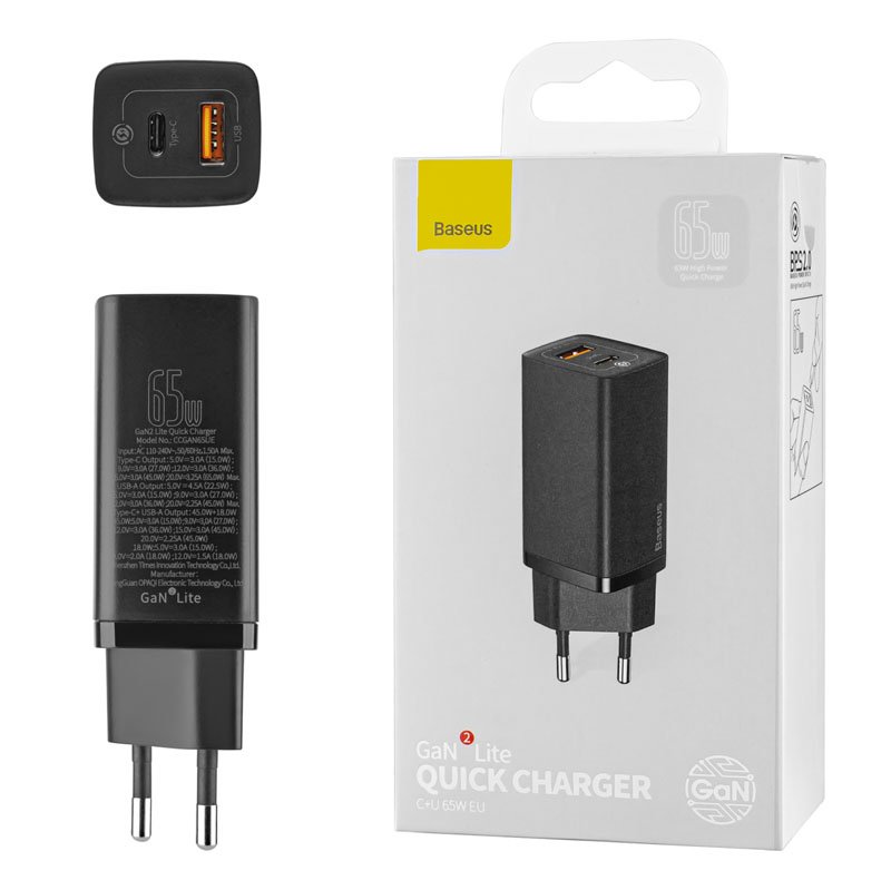 - Мережевий зарядний пристрій Baseus GaN2 Lite Quick Charger C+U 65W EU Black (CCGAN2L-B01)-