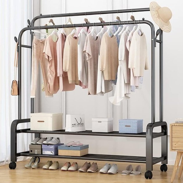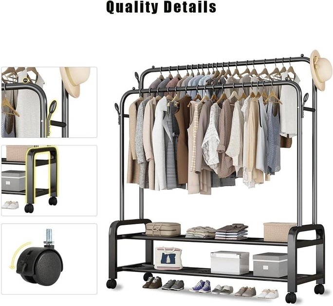 Вішалка-стійка для одягу YP-610 — металева мобільна стійка з полицею для гардеробу. Практичне рішення для зберігання та організації одягу вдома, у гардеробній, офісі або шоурумі. Конструкція виконана з металу, що забезпечує надійність і стабільність у щоденному використанні, а наявність полиці додає зручності для розміщення взуття чи коробок.