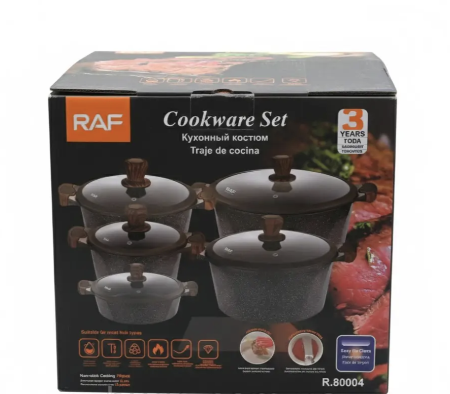 Набір каструль 5 в 1 RAF set r-80004 — практичний комплект кухонного посуду з антипригарним покриттям, створений для щоденного приготування різних страв. Модель r-80004 поєднує стильний вигляд і надійність у використанні, забезпечуючи комфорт під час готування та простий догляд.