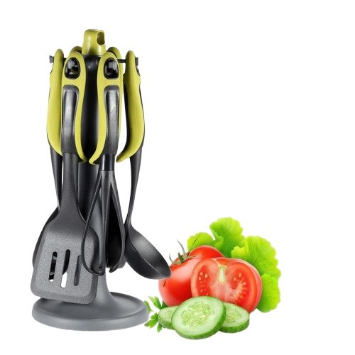 Набір силіконового кухонного приладдя на підставці (7 предметів) — практичний кухонний набір для щоденного використання, спеціально підходить для антипригарного посуду. Силіконові робочі частини дбайливо контактують з поверхнею, а підставка допомагає зручно зберігати приладдя та підтримувати порядок на кухні.