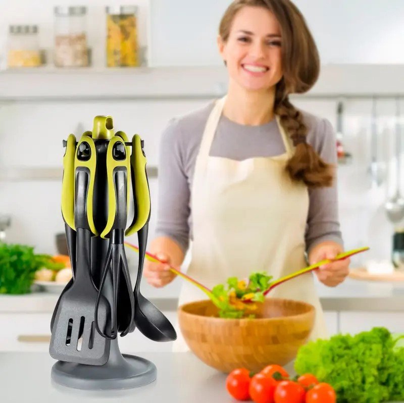 ```Набір силіконового кухонного приладдя на підставці (7 предметів) — практичний кухонний набір для щоденного використання, спеціально підходить для антипригарного посуду. Силіконові робочі частини дбайливо контактують з поверхнею, а підставка допомагає зручно зберігати приладдя та підтримувати порядок на кухні.