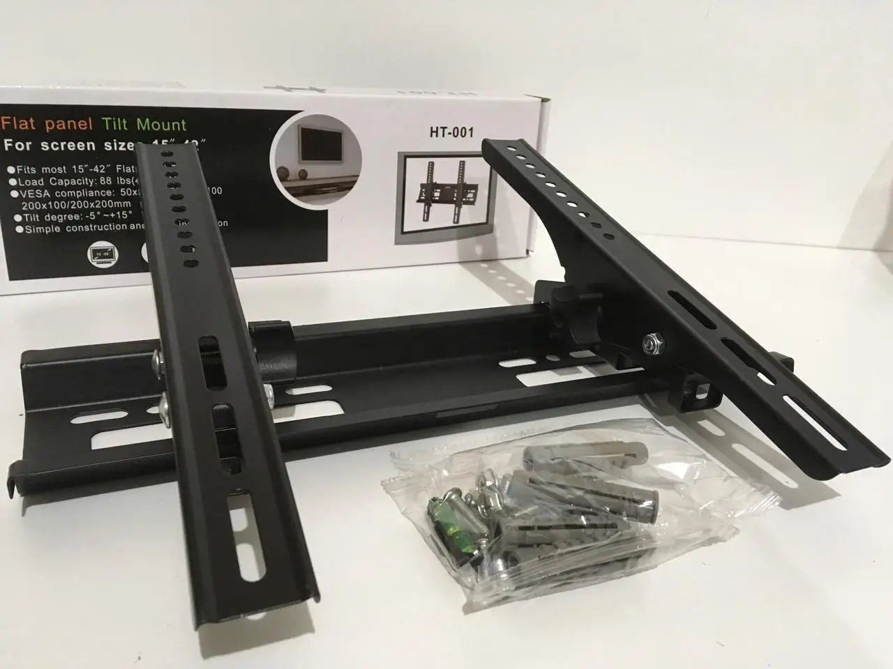 Кронштейн для телевізора HT001 15"-42" — настінне кріплення для ТВ, розраховане на екрани діагоналлю 15–42 дюйми та навантаження до 40 кг. Практичне рішення для дому або офісу, яке допомагає акуратно розмістити телевізор на стіні та заощадити місце. Надійний і якісний варіант для щоденного використання.