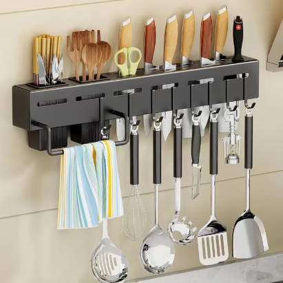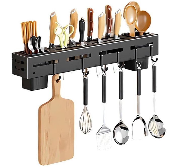 Настінний тримач для ножів та кухонних аксесуарів — підвісний органайзер-підставка для зручного зберігання кухонних приладів. Допомагає підтримувати порядок на кухні та тримати потрібні інструменти під рукою. Практичне рішення для щоденного використання: надійний, зручний та розрахований на регулярне навантаження.