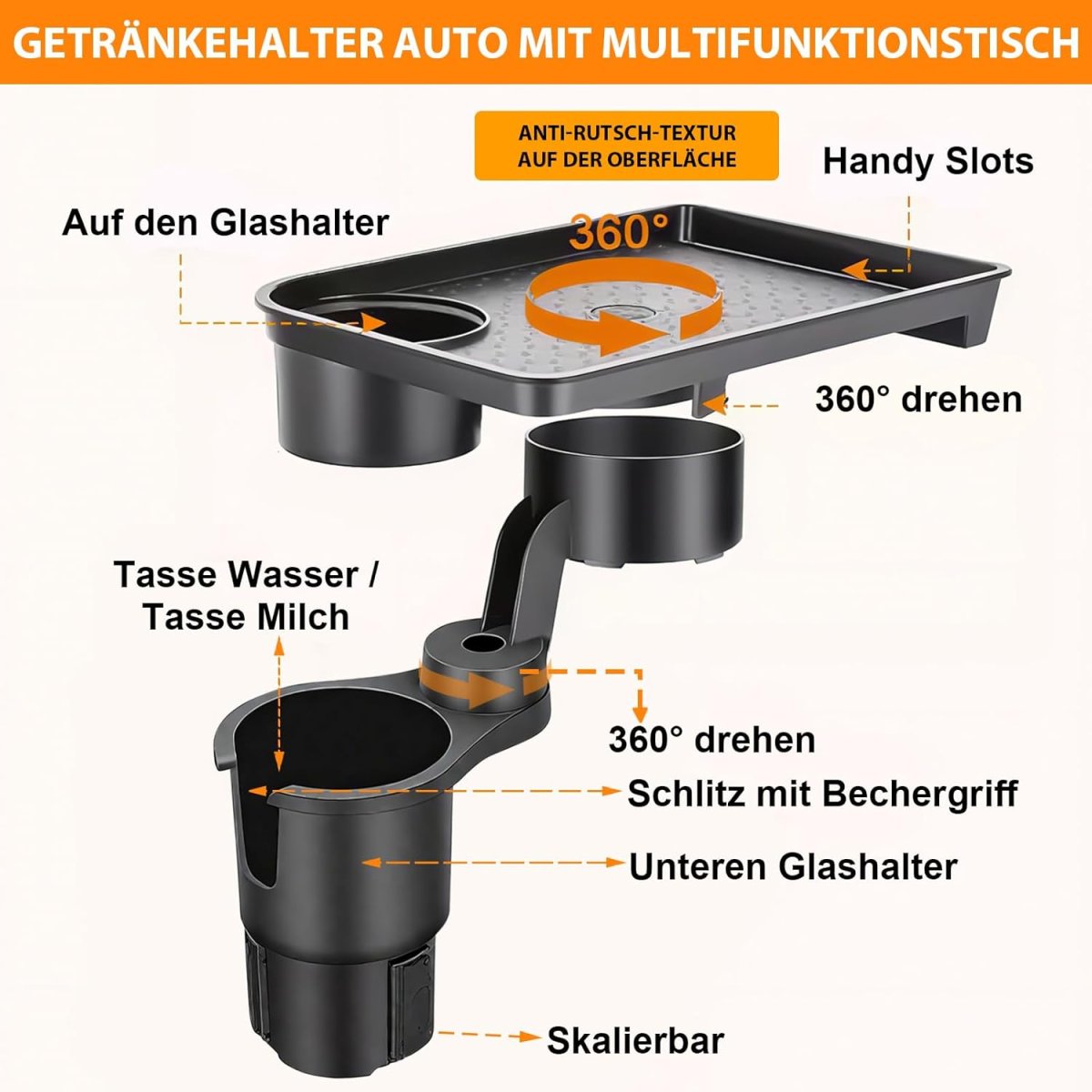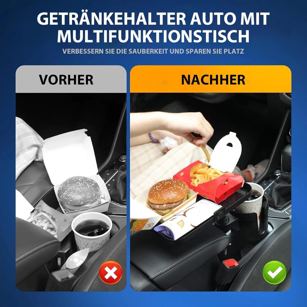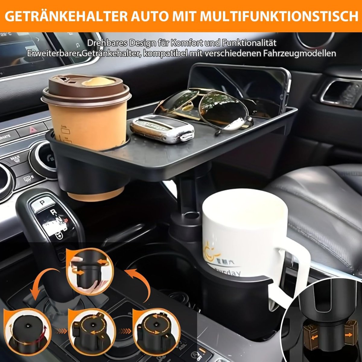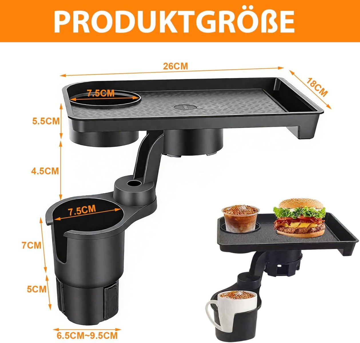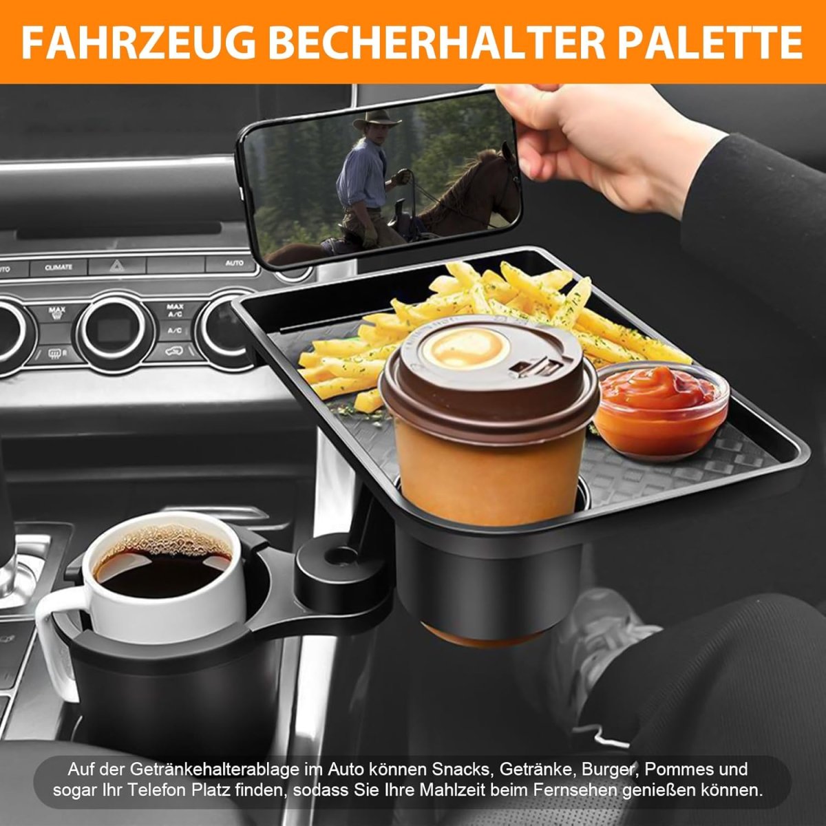 Універсальний автомобільний підстаканник для їжі — зручний піднос у авто з подвійним підстаканником, який допомагає акуратно розмістити напої та перекус під час поїздок. Практичне рішення для щоденного використання: підтримує порядок у салоні та робить дорогу комфортнішою. Виріб якісний і надійний, розрахований на регулярне користування.