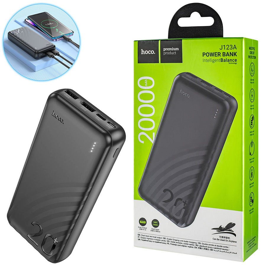 ```Універсальна мобільна батарея HOCO J123A Element 20000mAh Black — якісний та надійний павербанк для щоденного використання. Підійде для підзарядки смартфонів та інших портативних пристроїв у дорозі, на роботі чи під час подорожей.