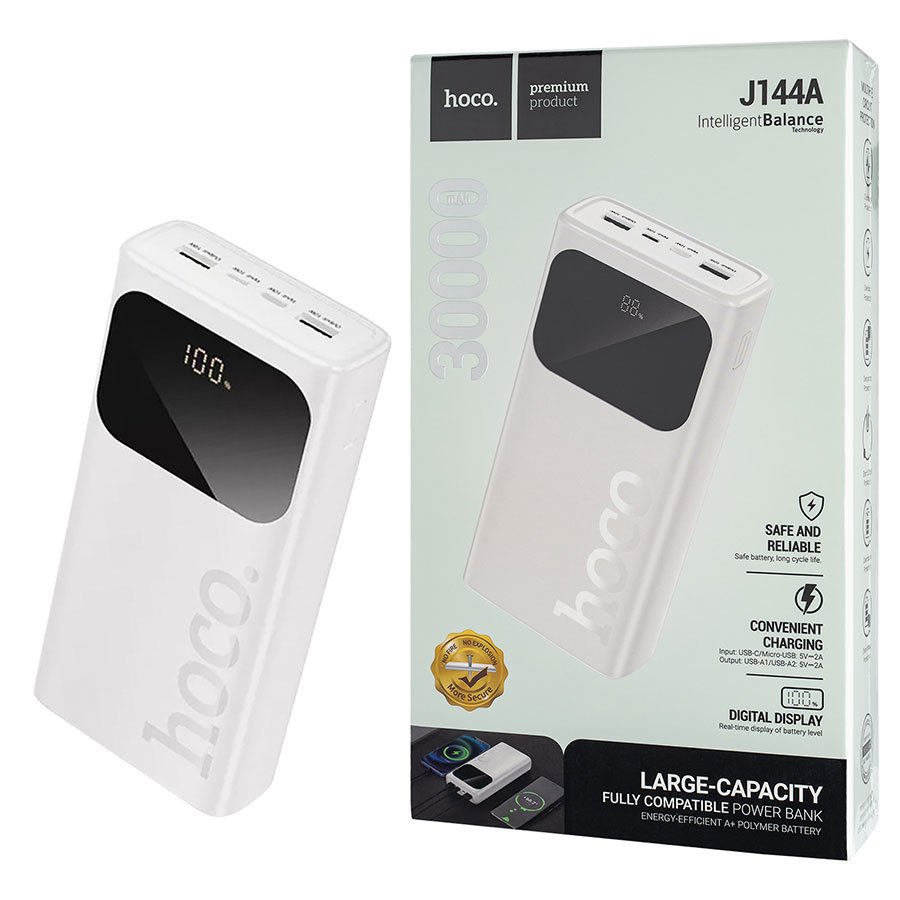 Універсальна мобільна батарея HOCO J144A Hymn 30000mAh (white) — місткий павербанк для щоденного використання. Якісний та надійний аксесуар, який допоможе підтримувати заряд ваших пристроїв у дорозі, на роботі чи під час подорожей.