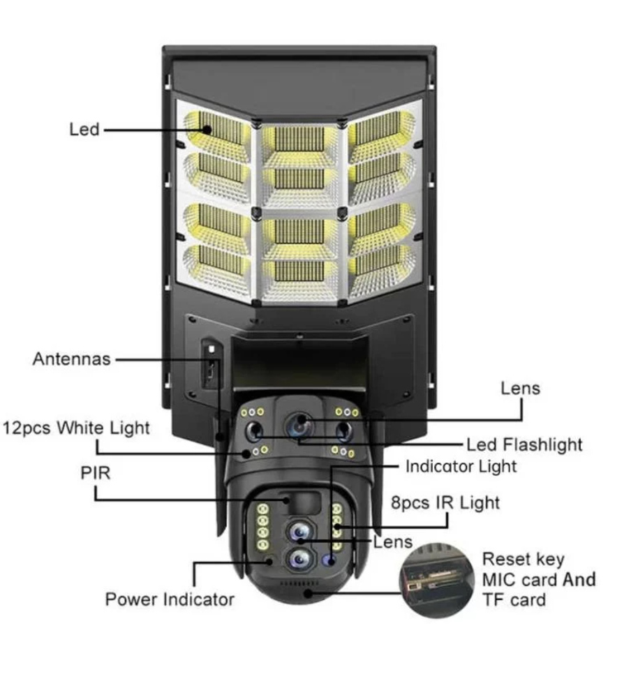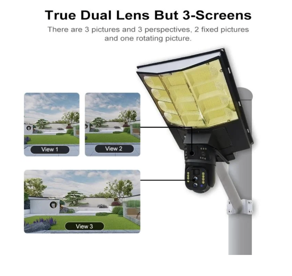 Вулична PTZ камера відеоспостереження з LED-лампою та сонячною панеллю SPM-XA01 — практичне рішення для охорони території на щодень. Модель поєднує PTZ-камеру, LED-ліхтар та сонячну панель, що робить її зручною для встановлення на вулиці. Камера має роздільну здатність 4 Мп і виконана на 2 об’єктива для кращого контролю зони спостереження. Підійде для двору, приватного будинку, дачі чи господарських об’єктів.