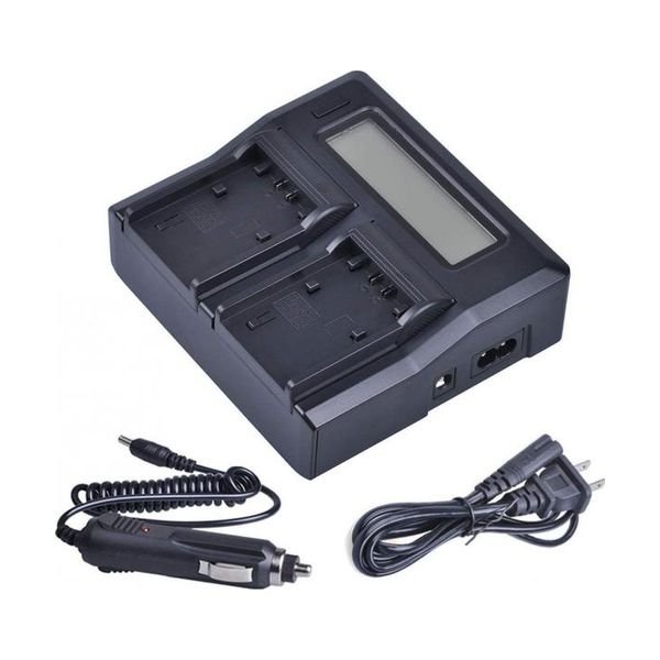Комплектація: Подвійний DC-LCD зарядний пристрій двома слотами під батарею NP-FH50 NP-FH70 NP-FH100, шнур-адаптер для 220В, автомобільний шнур для 12-24В, інструкція.