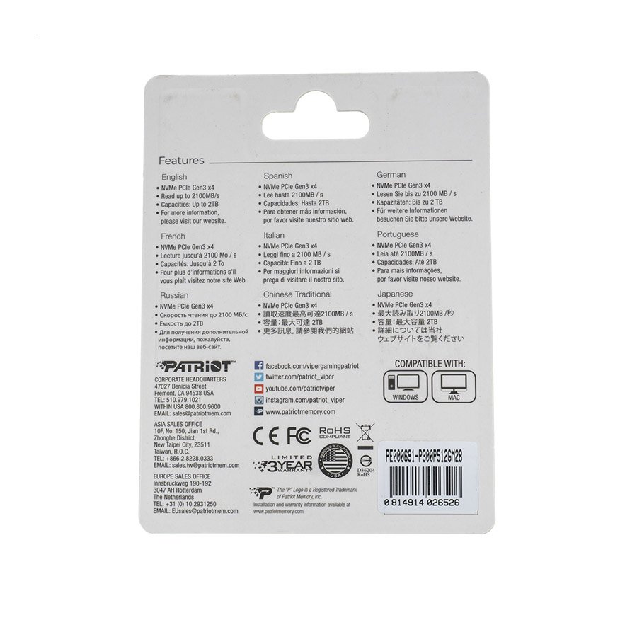 SSD Patriot P300 Series 512GB (P300P512GM28) — якісний і надійний твердотільний накопичувач формату M.2 2280 для щоденного використання. Підключення через NVMe та PCI Express 3.0 x4 забезпечує високу швидкодію системи, швидке завантаження ОС і програм, а 3D NAND TLC — стабільну роботу та ефективне зберігання даних.
