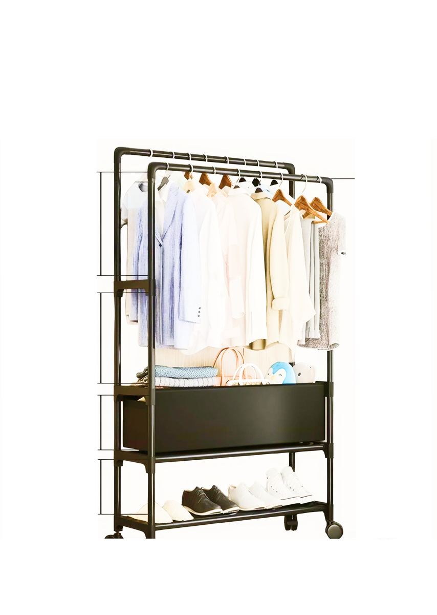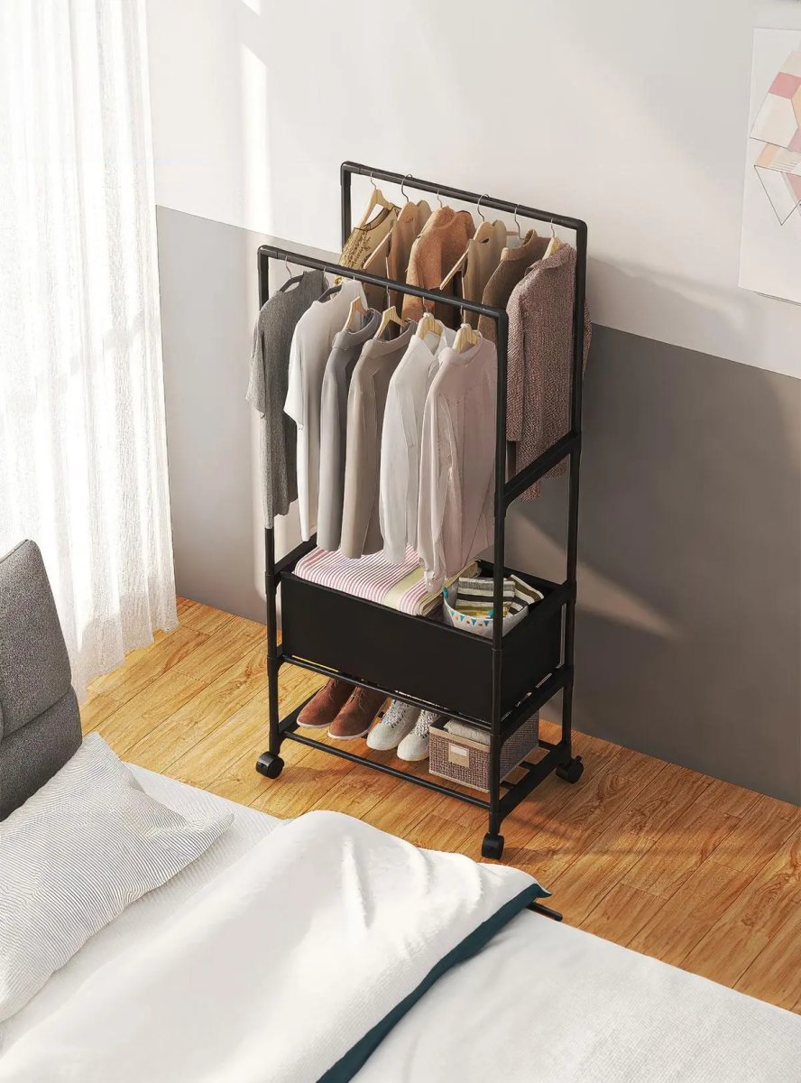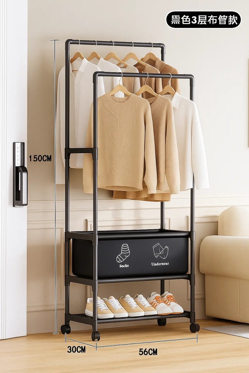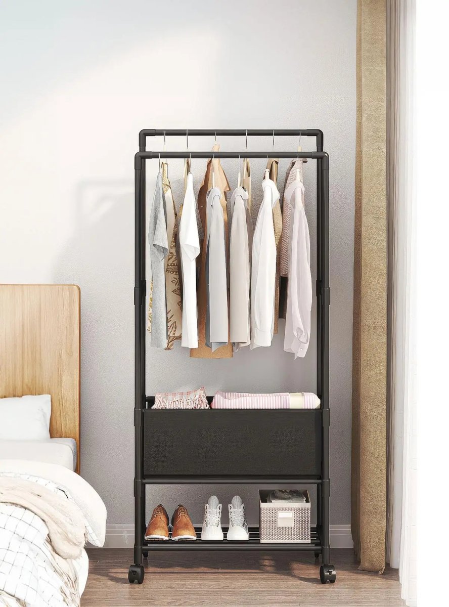 Стійка-Вішалка на колесах для речей та взуття YH9918-3A — практична телескопічна стійка для одягу з регульованою висотою. Завдяки мобільній конструкції на колесах її зручно переміщати по кімнаті, а наявність місця для взуття допомагає підтримувати порядок у щоденному користуванні. Підійде для дому, гардеробної, офісу або шоуруму. Якісний та надійний варіант для щоденного використання.