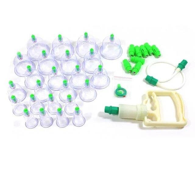 ```Вакуумні банки з насосом, 24 шт — великий набір вакуумних банок для масажу, зручний для домашнього щоденного використання. Підходить для проведення вакуумного масажу на різних ділянках тіла завдяки наявності банок різних розмірів та насоса для створення вакууму.
