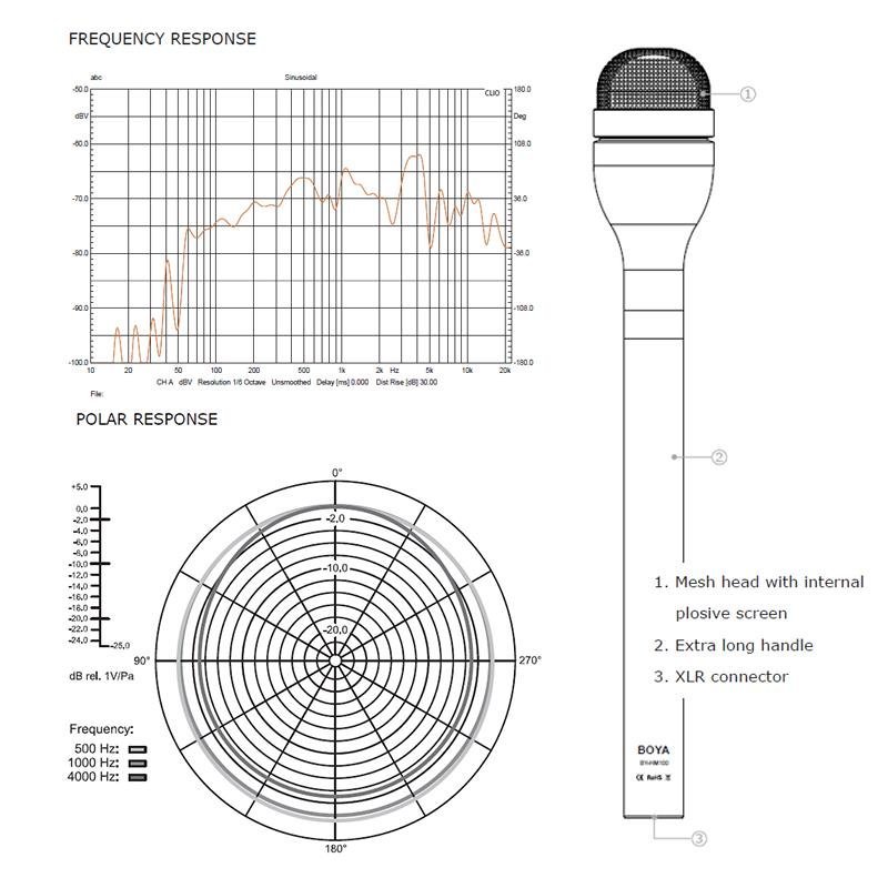 Істотним плюсом мікрофону Boya BY-HM100 є те, що він не потребує фантомного або додаткового живлення (батареї), що дає можливість працювати з широким вибором рекордерів. Мікрофон має з'єднання XLR Jack, до комплекту входить м'який чохол на блискавці для зручного зберігання та перенесення.