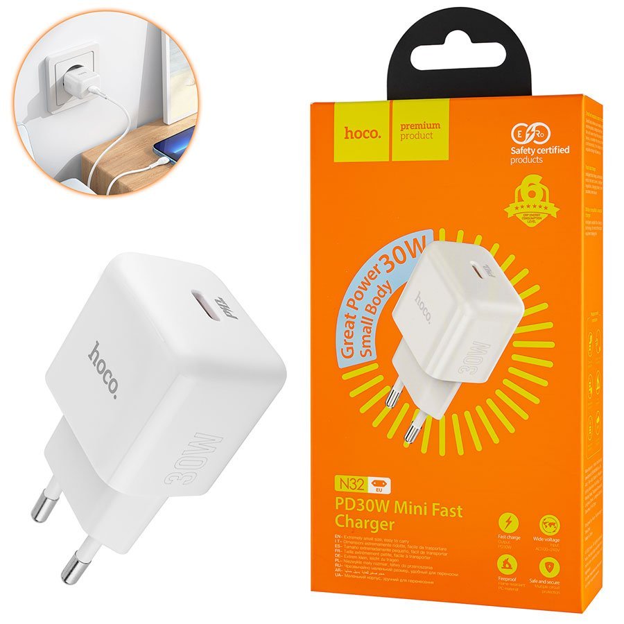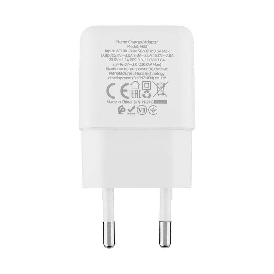 Зарядний пристрій HOCO N32 Glory PD30W білий 6931474789914 — компактний і потужний адаптер для швидкої та безпечної зарядки смартфонів.